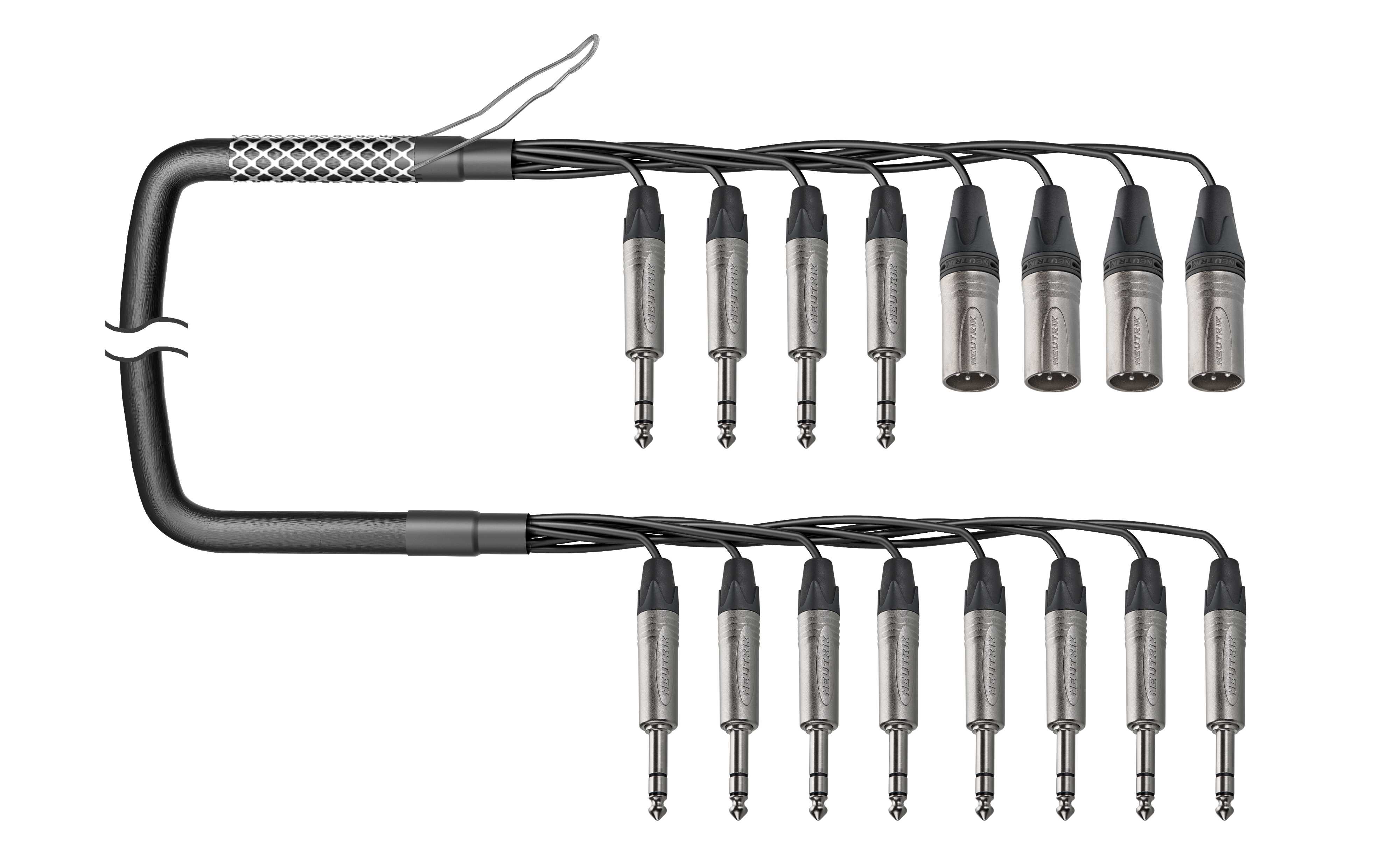 8-кан. (4-IN/4-OUT) аудиомультикорный кабель, Standart, коса (4х Jack 6.3 мм стерео штекер, 4х XLR штекер), защитная корзина > коса (8х Jack 6.3 мм стерео штекер). Комплектующие: разъемы Neutrik NP3X; NC3MXX; Мультикор аналоговый Canare MR202-8AT; цвет: черный.