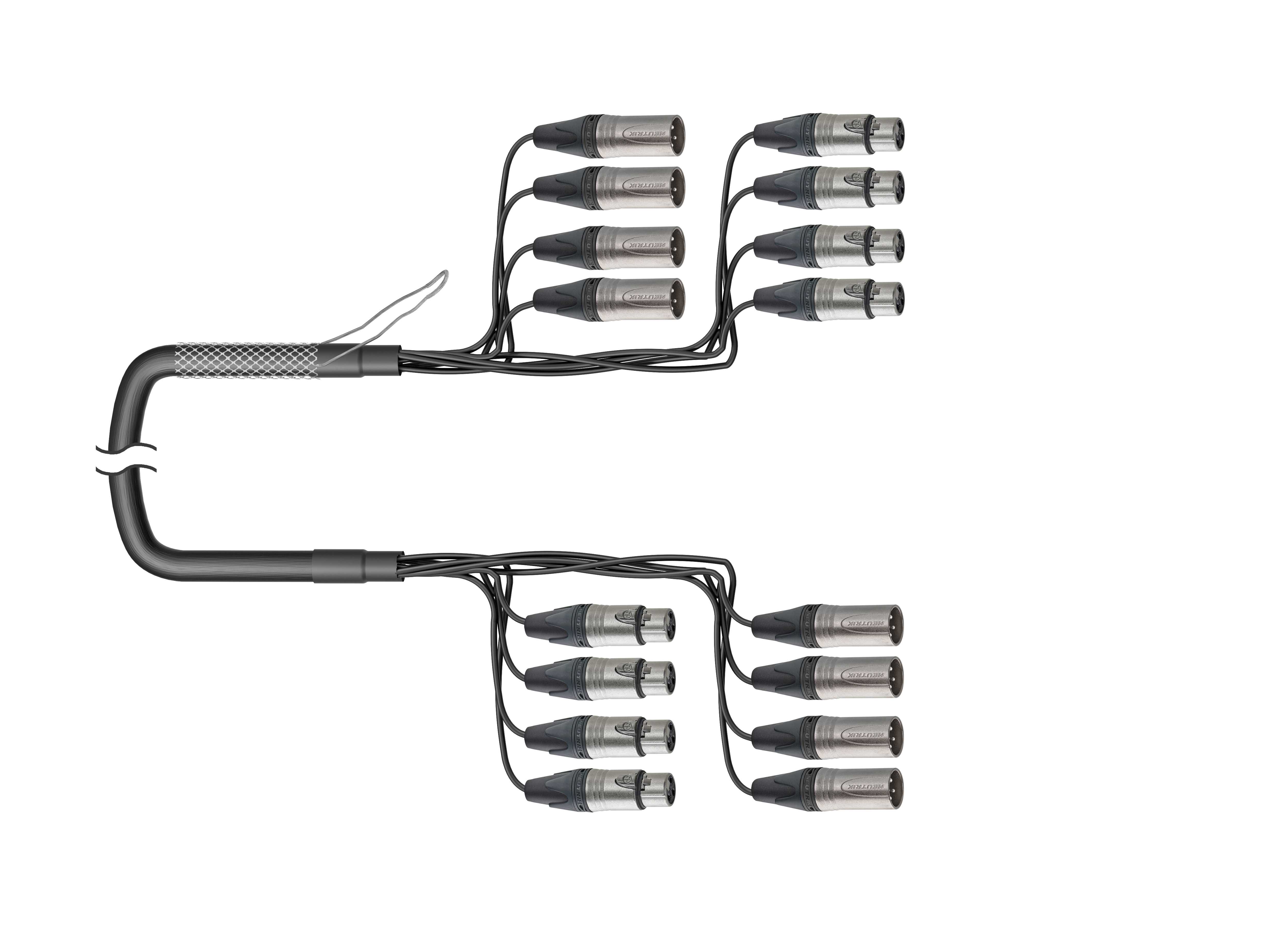 8-кан. (4-IN/4-OUT) аудиомультикорный кабель, Standart, коса (4х XLR3 штекер/4х XLR3 гнедо), защитная корзина > коса (4х XLR3 гнездо/4х XLR3 штекер). Комплектующие: разъемы Neutrik NC3MXX; NC3FXX; Мультикор аналоговый Canare MR202-8AT; цвет: черный.