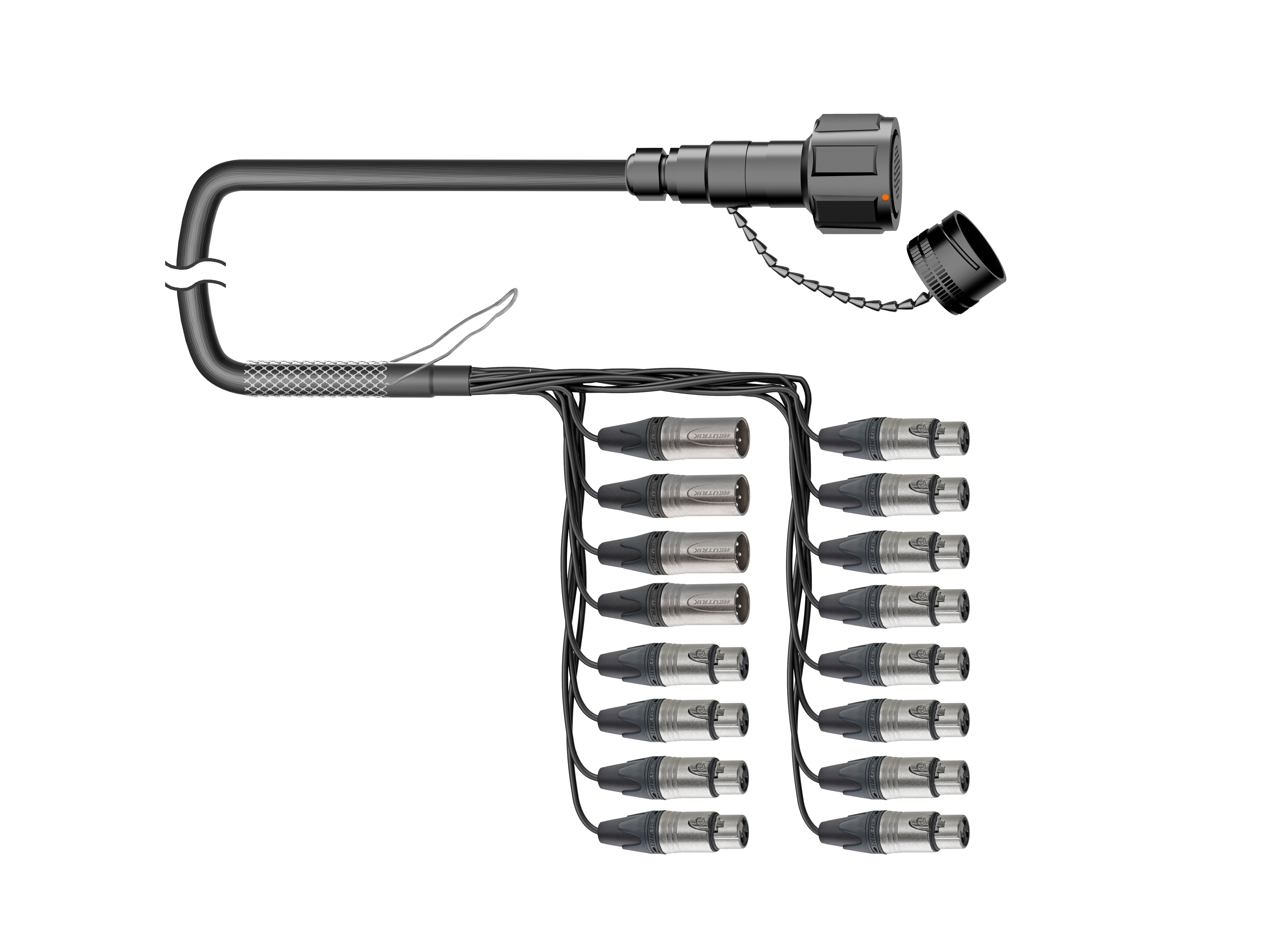 16-кан. (4-IN/12-OUT) аудиомультикорный кабель, Standart, Мультипин гнездо > коса (4х XLR3 штекер, 12х XLR3 гнездо), защитная корзина. Комплектующие: разъемы Круглый (Мультипин); Neutrik NC3MXX; NC3FXX; Мультикор аналоговый Canare MR202-16AT; цвет: черный.