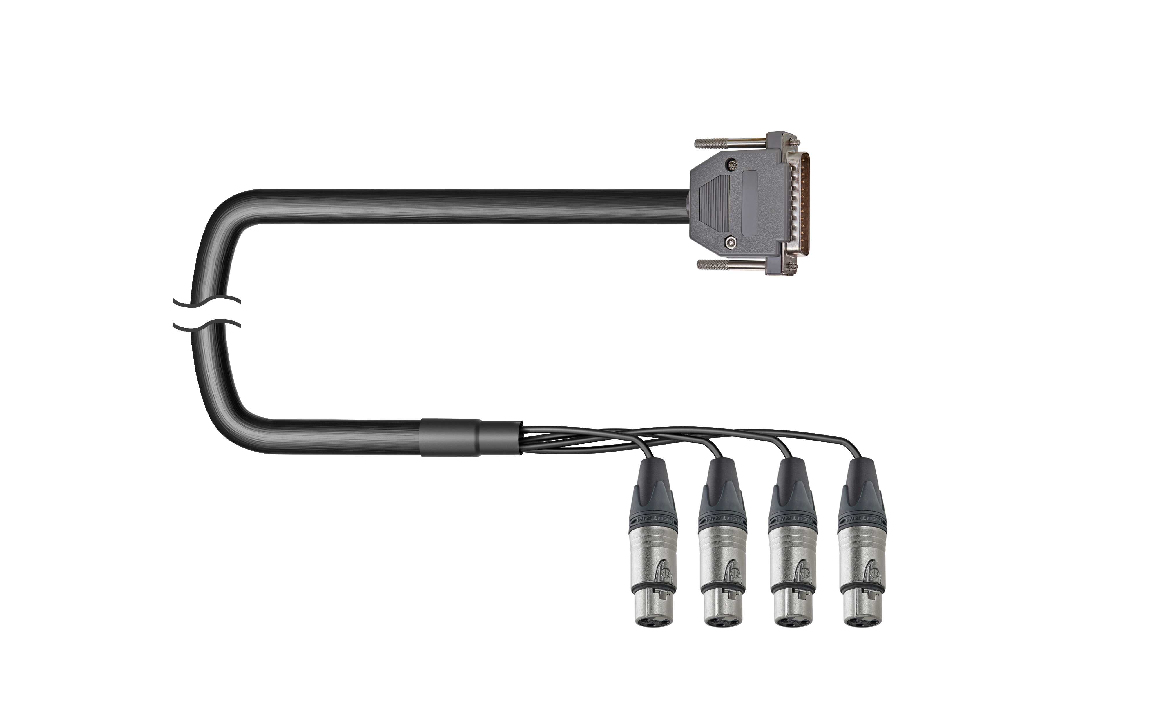 4-кан. (4-IN) аудиомультикорный кабель, Standart, (D-SUB 25 пин штекер > 4х XLR3 гнездо). Комплектующие: разъемы DB-25; Neutrik NC3FXX; Мультикор аналоговый Canare MR202-4AT; цвет: черный.