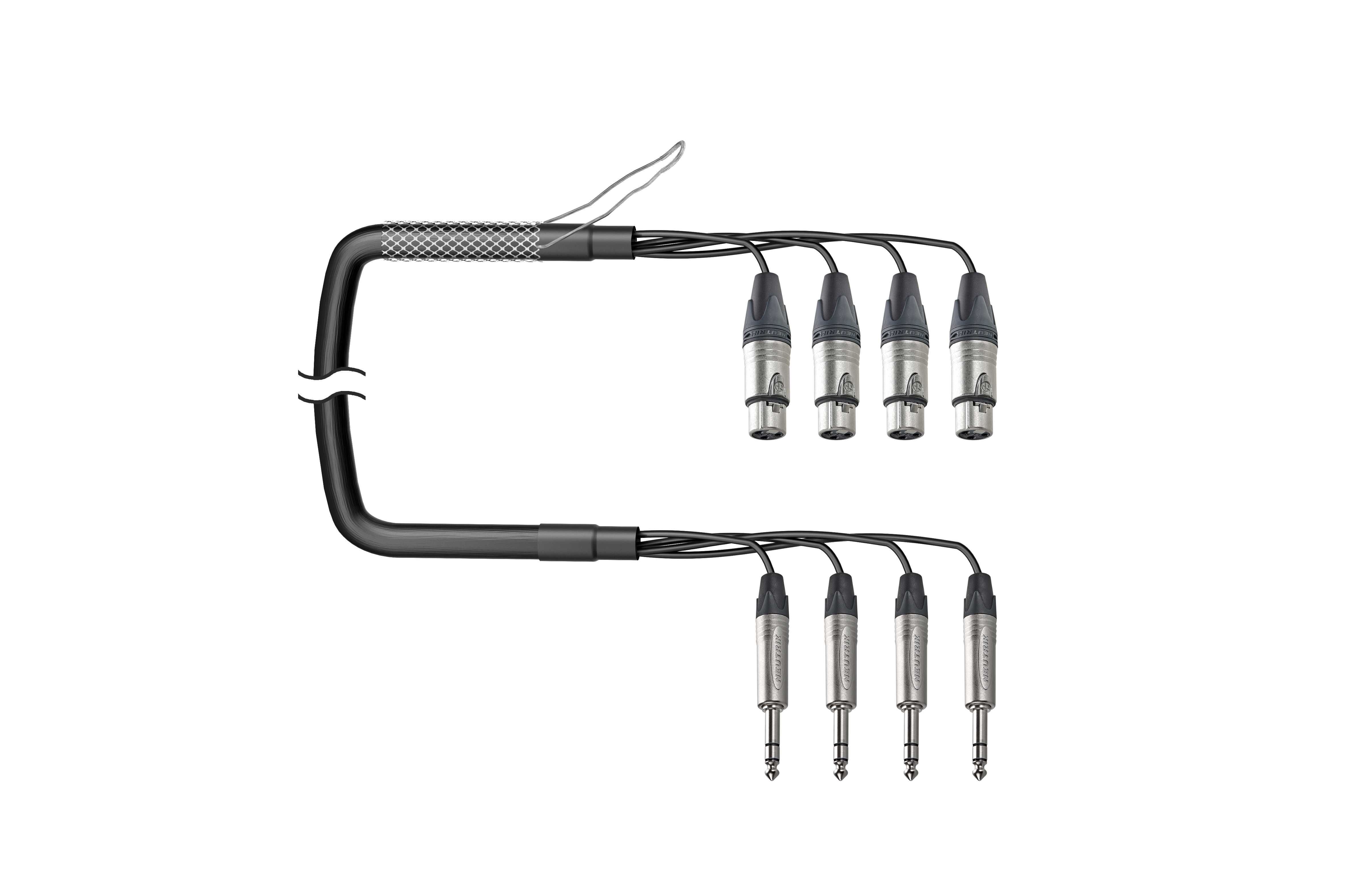 4-кан. (4-OUT) аудиомультикорный кабель, Standart, коса (4х XLR3 гнездо), защитная корзина > коса (4х Jack 6.3 мм стерео штекер). Комплектующие: разъемы Neutrik NC3FXX; NP3X; Мультикор аналоговый Canare MR202-4AT; цвет: черный.