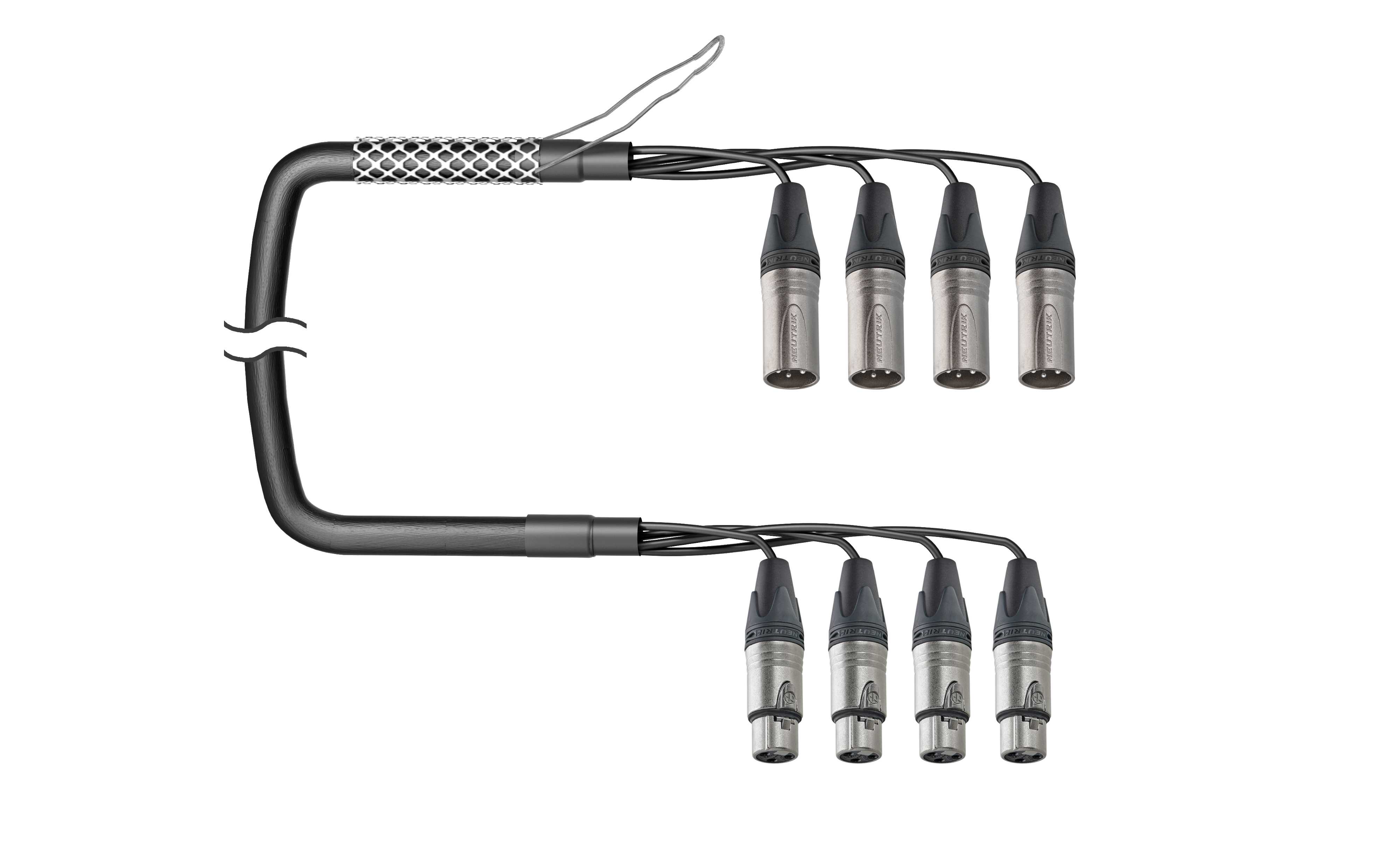4-кан. (4-IN) аудиомультикорный кабель, Standart, коса (4х XLR3 штекер), защитная корзина > коса (4х XLR3 гнездо). Комплектующие: разъемы Neutrik NC3MXX; NC3FXX; Мультикор аналоговый Canare MR202-4AT; цвет: черный