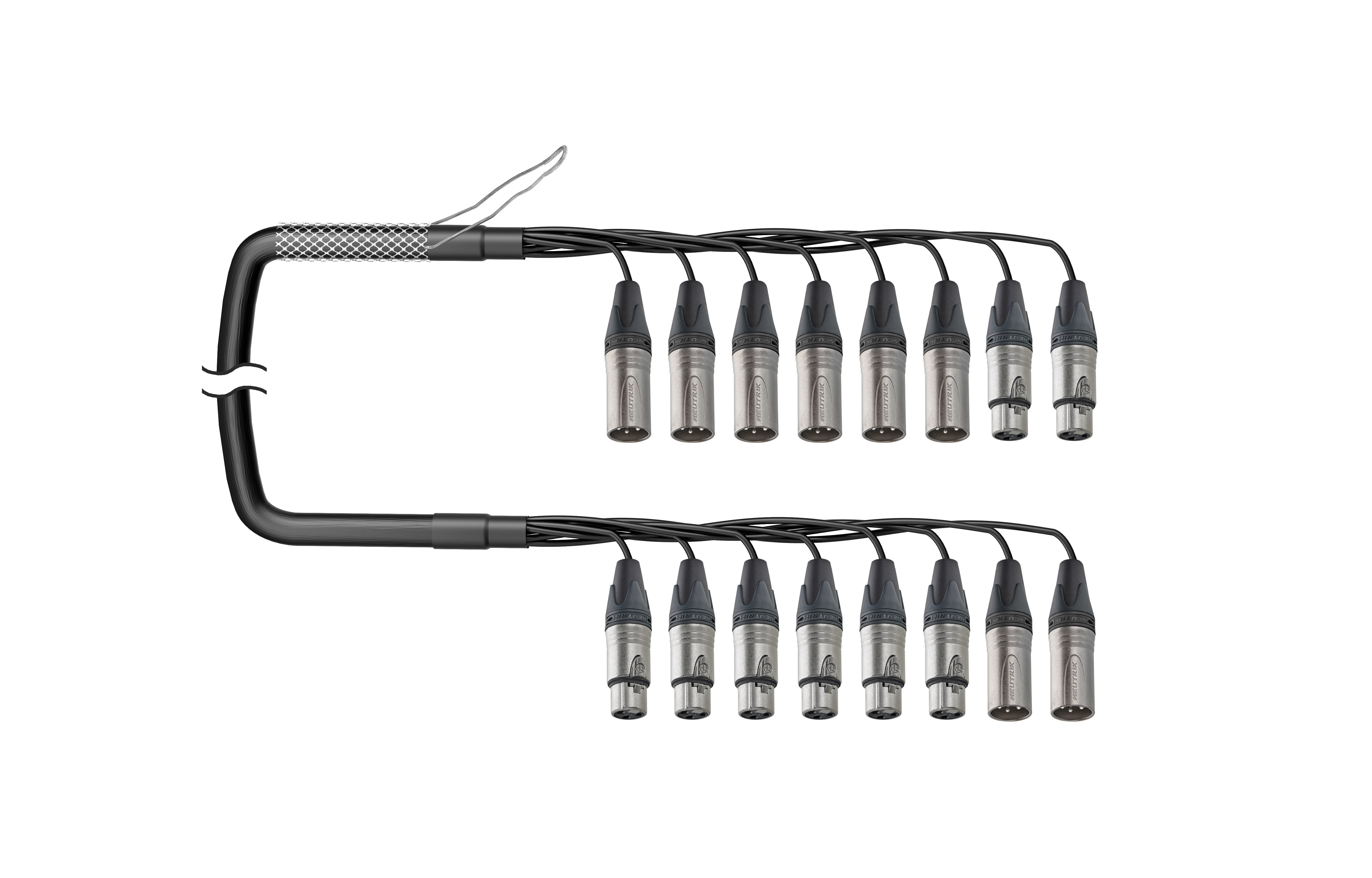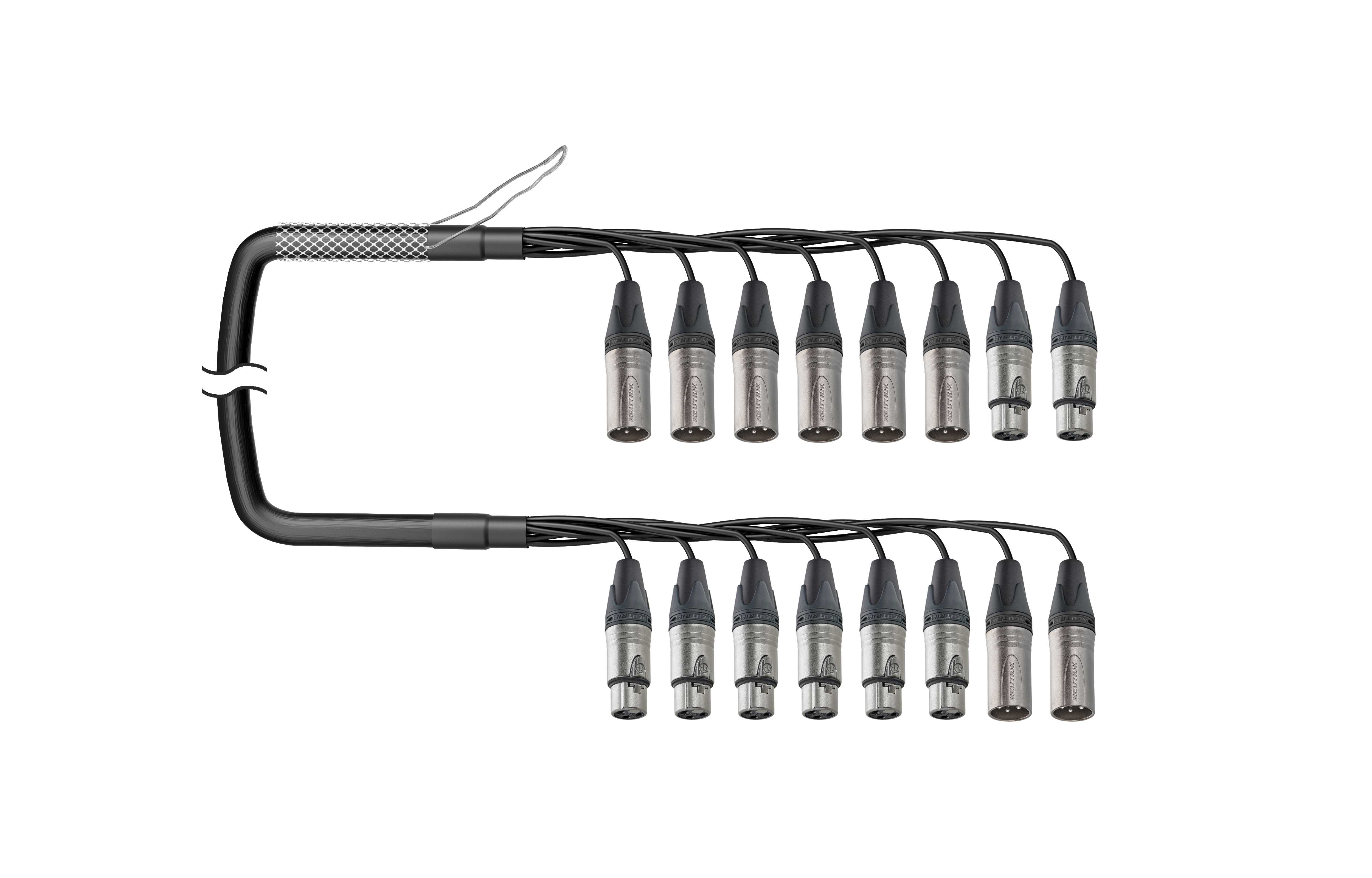 8-кан. (6-IN/2-OUT) аудиомультикорный кабель, Standart, коса (6х XLR3 штекер/2х XLR3 гнедо), защитная корзина > коса (6х XLR3 гнездо/2х XLR3 штекер). Комплектующие: разъемы Neutrik NC3MXX; NC3FXX; Мультикор аналоговый Canare MR202-8AT; цвет: черный.