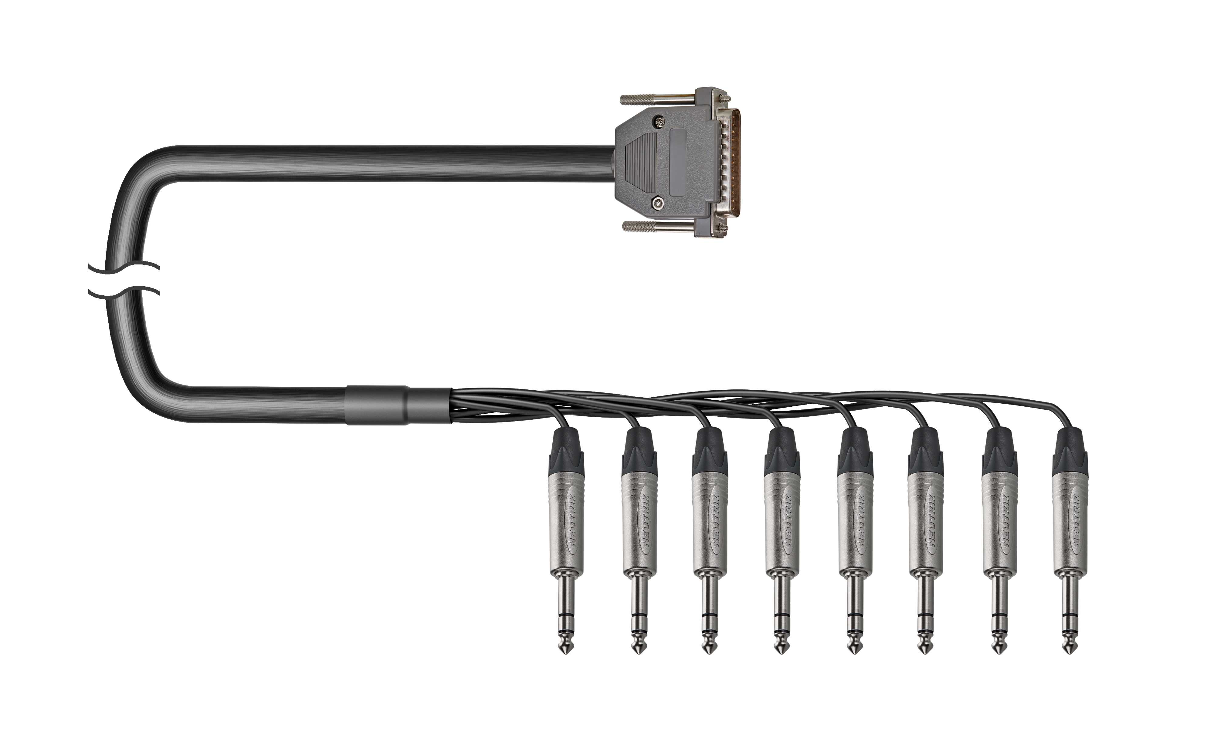 8-кан. (8-IN) аудиокабель, Standart, D-SUB 25 пин штекер > коса (8х Jack 6.3 мм стерео штекер). Комплектующие: разъемы D-SUB 25; Neutrik NP3X; Мультикор аналоговый Canare MR202-8AT; цвет: черный.