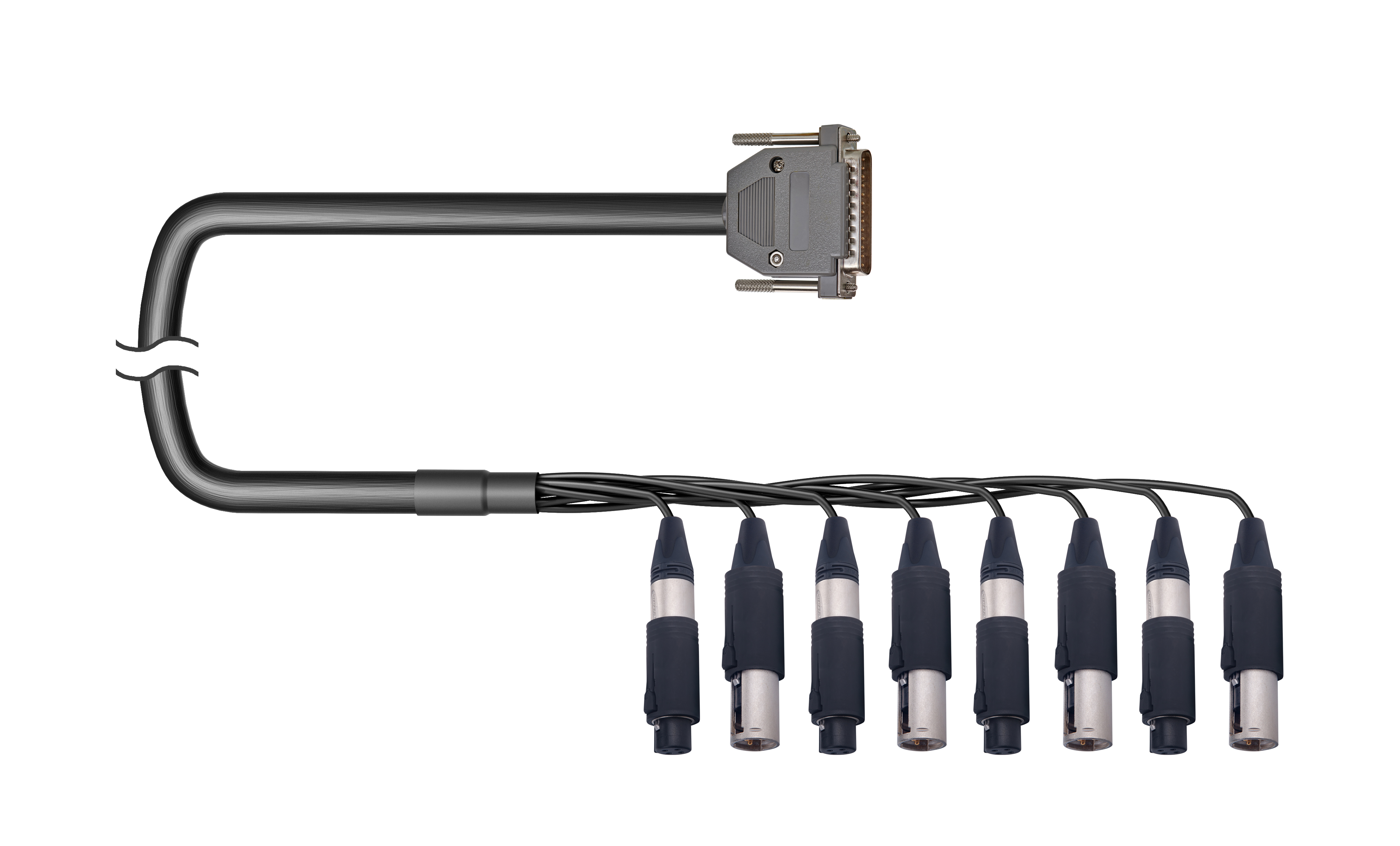 8-кан. аудиокабель, Standart, D-SUB 25 пин штекер > коса (адаптер- 8х XLR3 штекер/гнездо). Комплектующие: разъемы D-SUB 25; Neutrik NC3FM-C (XLR адаптер мама/папа); Мультикор аналоговый Canare MR202-8AT; цвет: черный.
