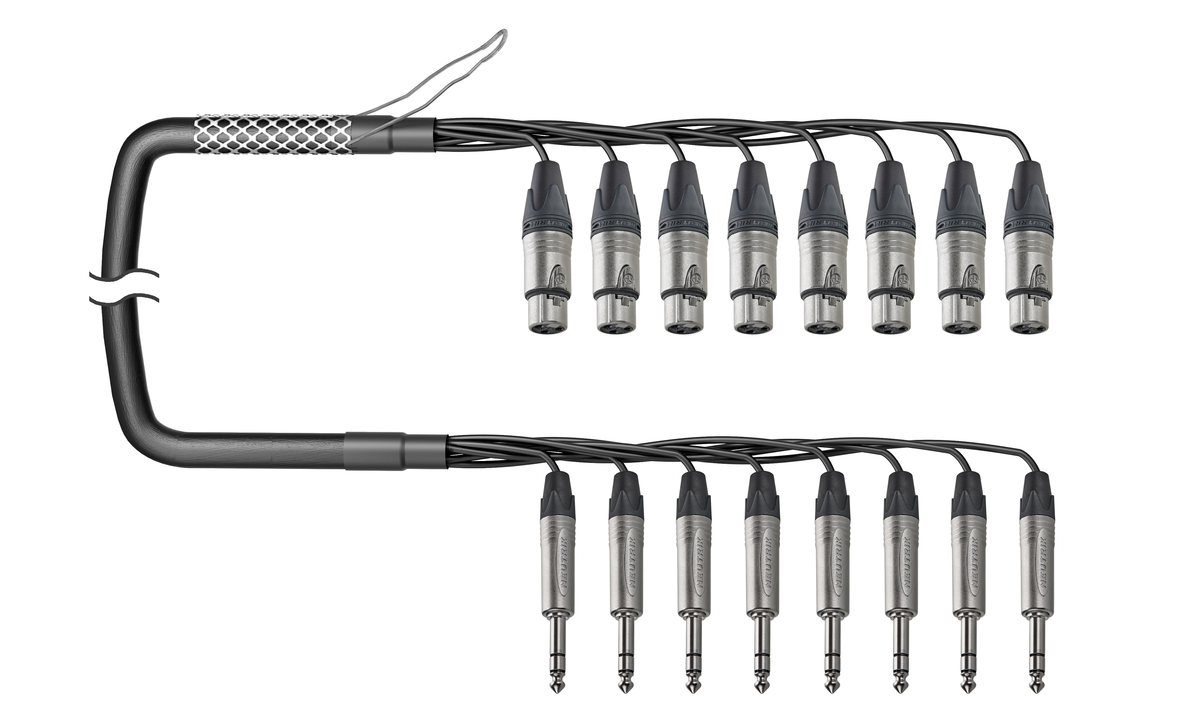 8-кан. (8-OUT) аудиомультикорный кабель, Standart, коса (8х XLR3 гнездо), защитная корзина > коса (8х Jack 6.3 мм стерео штекер). Комплектующие: разъемы Neutrik NC3FXX; NP3X; Мультикор аналоговый Canare MR202-8AT; цвет: черный.