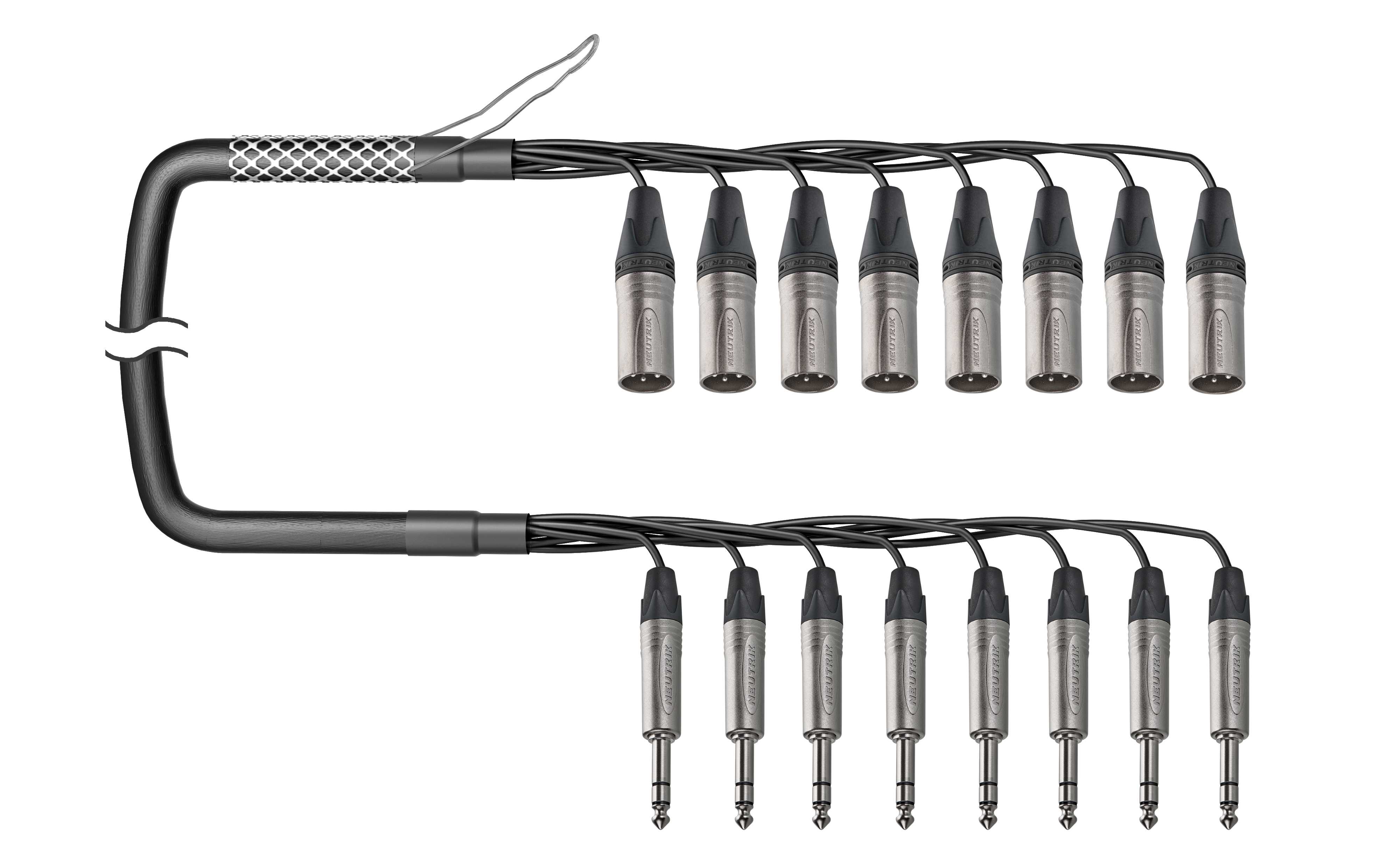 8-кан. (8-IN) аудиомультикорный кабель, Standart, коса (8х XLR3 штекер), защитная корзина > коса (8х Jack 6.3 мм стерео штекер). Комплектующие: разъемы Neutrik NC3MXX; NP3X; Мультикор аналоговый Canare MR202-8AT; цвет: черный.