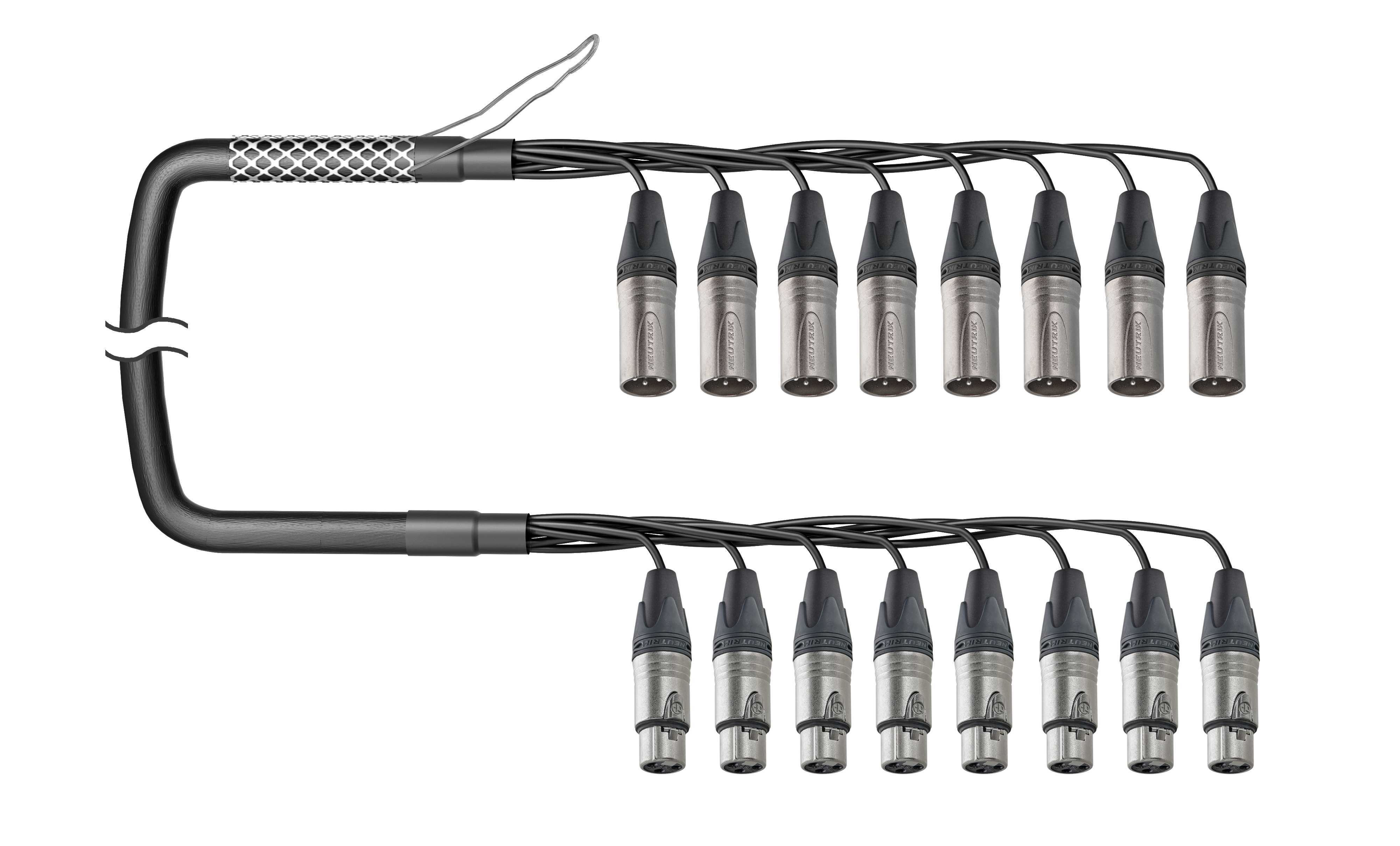 8-кан. (8-IN) аудиомультикорный кабель, Standart, коса (8х XLR3 штекер), защитная корзина > коса (8х XLR3 гнездо). Комплектующие: разъемы Neutrik NC3MXX; NC3FXX; Мультикор аналоговый Canare MR202-8AT; цвет: черный.