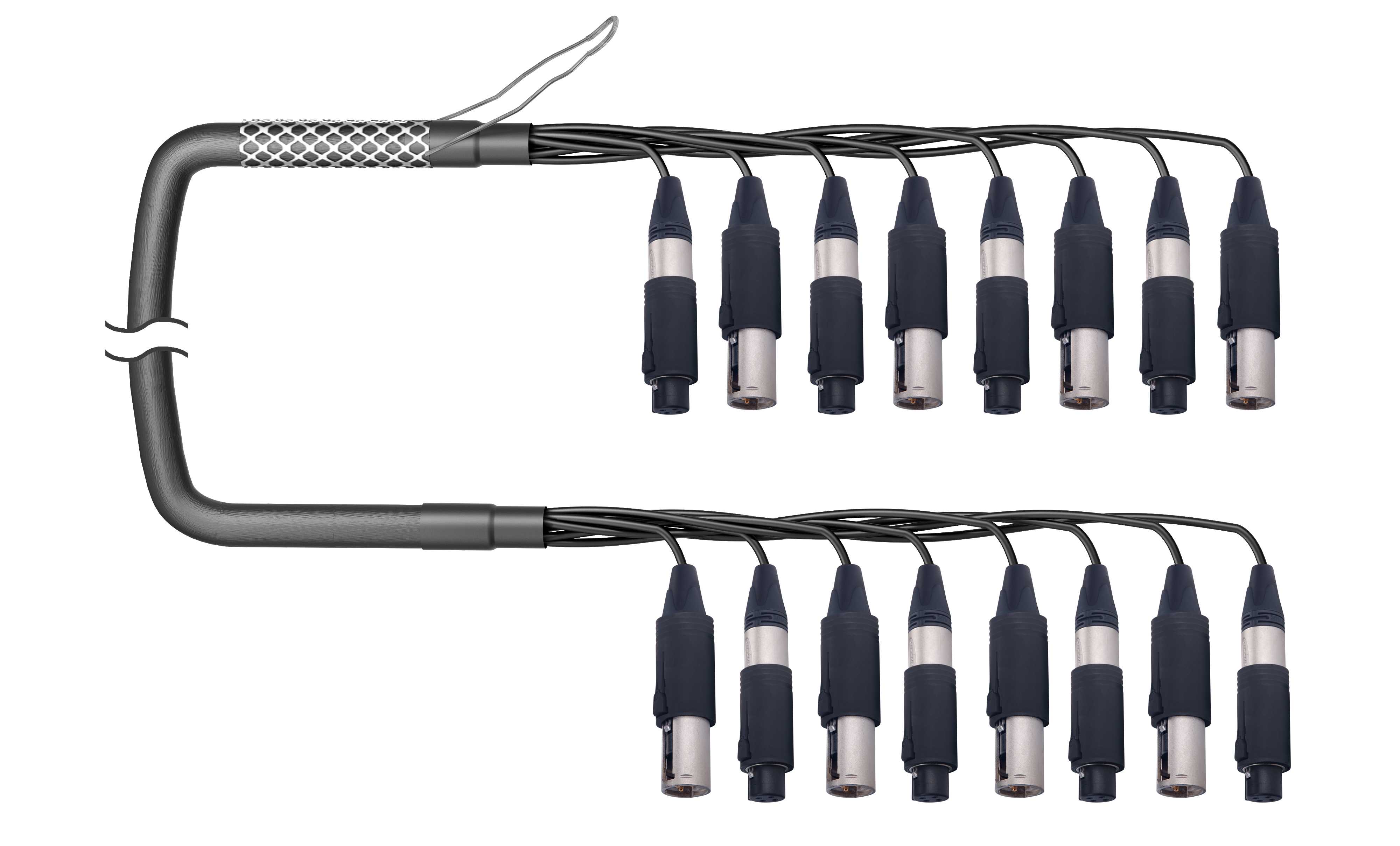 8-кан. (IN/OUT) аудиомультикорный кабель, Standart, коса (адаптер- 8х XLR3 штекер/гнездо), защитная корзина > коса (адаптер- 8х XLR3 штекер/гнездо). Комплектующие: разъемы Neutrik NC3FM-C (XLR адаптер мама/папа); Мультикор аналоговый Canare MR202-8AT; цвет: черный.
