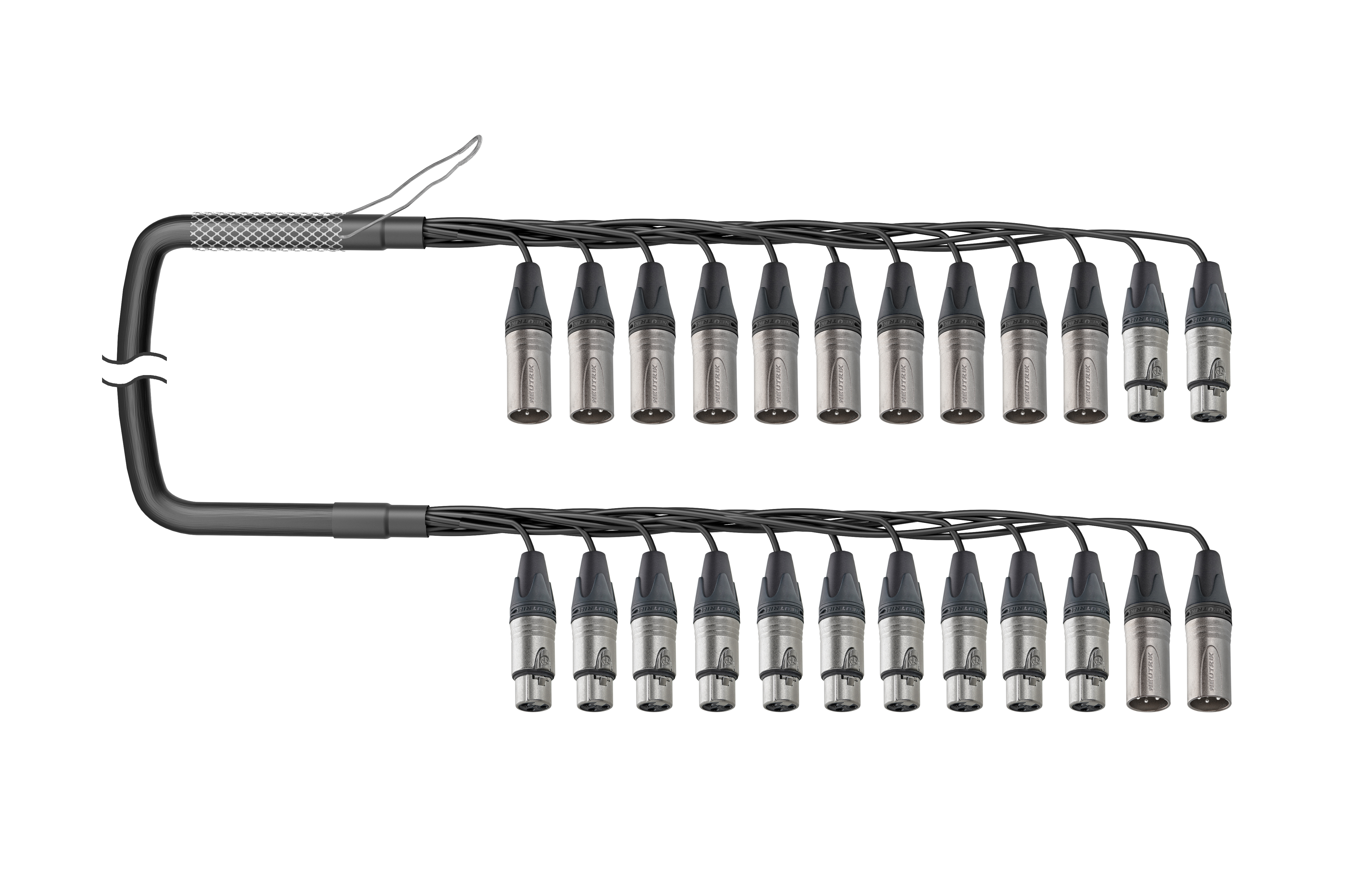 12-кан. (10-IN/2-OUT) аудиомультикорный кабель, Standart, коса (10х XLR3 штекер/2х XLR3 гнездо), защитная корзина > коса (10х XLR3 гнездо/2х XLR3 штекер). Комплектующие: разъемы Neutrik NC3MXX; NC3FXX; Мультикор аналоговый Canare MR202-12AT; цвет: черный.