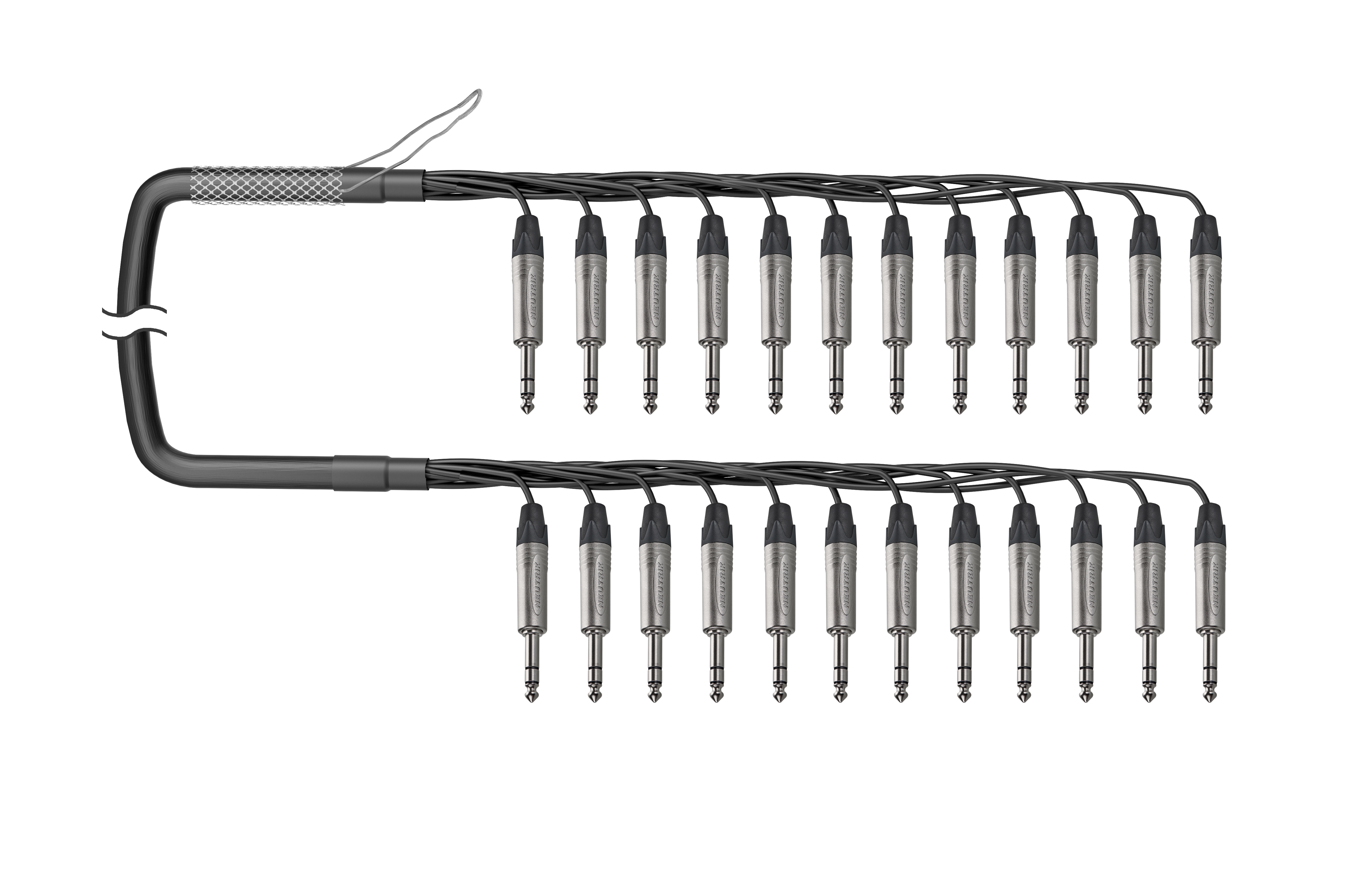 12-кан. балансный аудиомультикорный кабель, Standart, коса (12х Jack 6.3 мм стерео штекер), защитная корзина > коса (12х Jack 6.3 мм стерео штекер). Комплектующие: разъемы Neutrik NP3X; Мультикор аналоговый Canare MR202-12AT; цвет: черный.