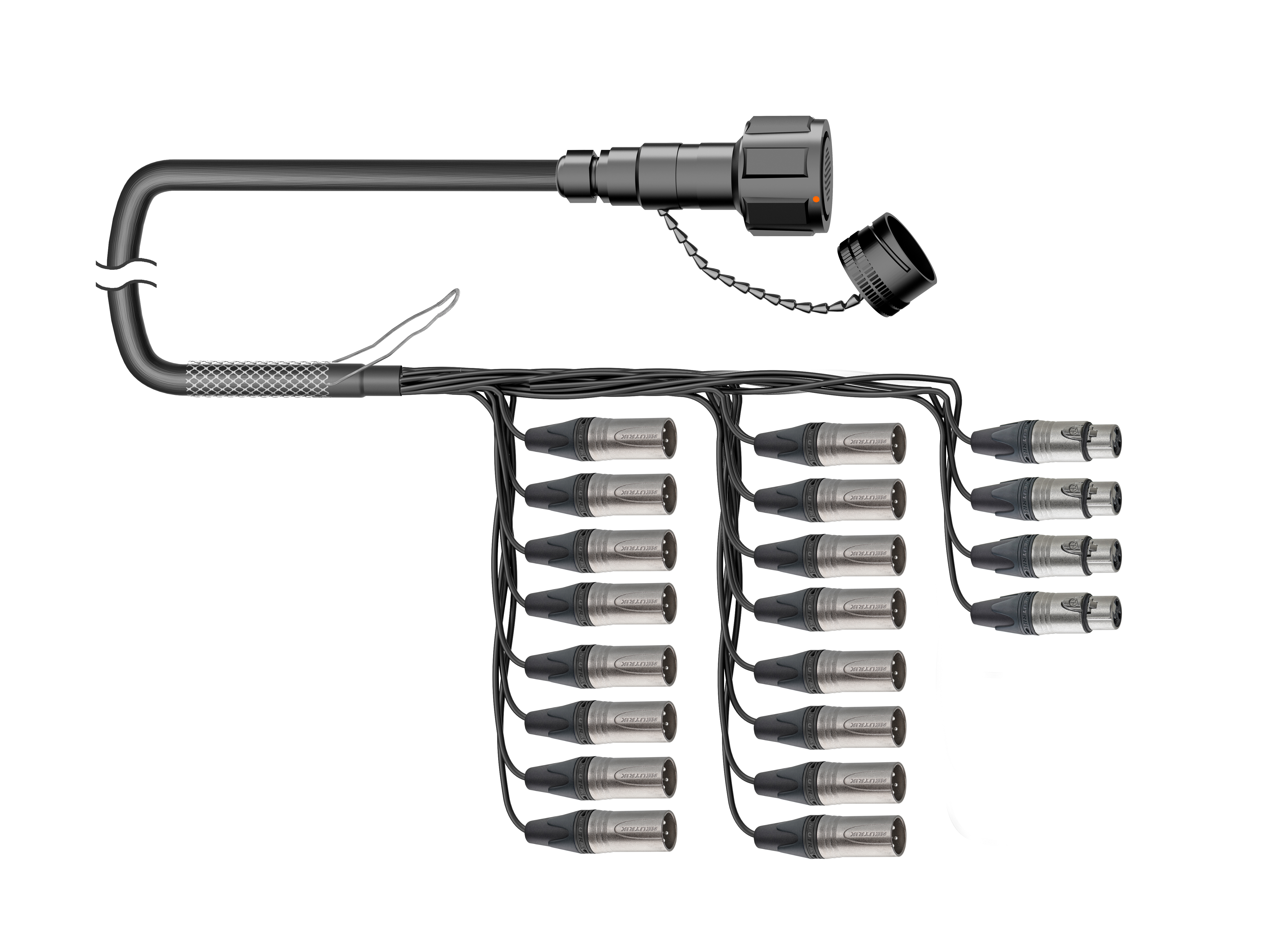 20-кан. (16-IN/4-OUT) аудиомультикорный кабель, Standart, Мультипин гнездо > коса (16х XLR3 штекер, 4х XLR3 гнездо), защитная корзина. Комплектующие: разъемы Круглый (Мультипин); Neutrik NC3MXX; NC3FXX; Мультикор аналоговый Canare MR202-24AT; цвет: черный.