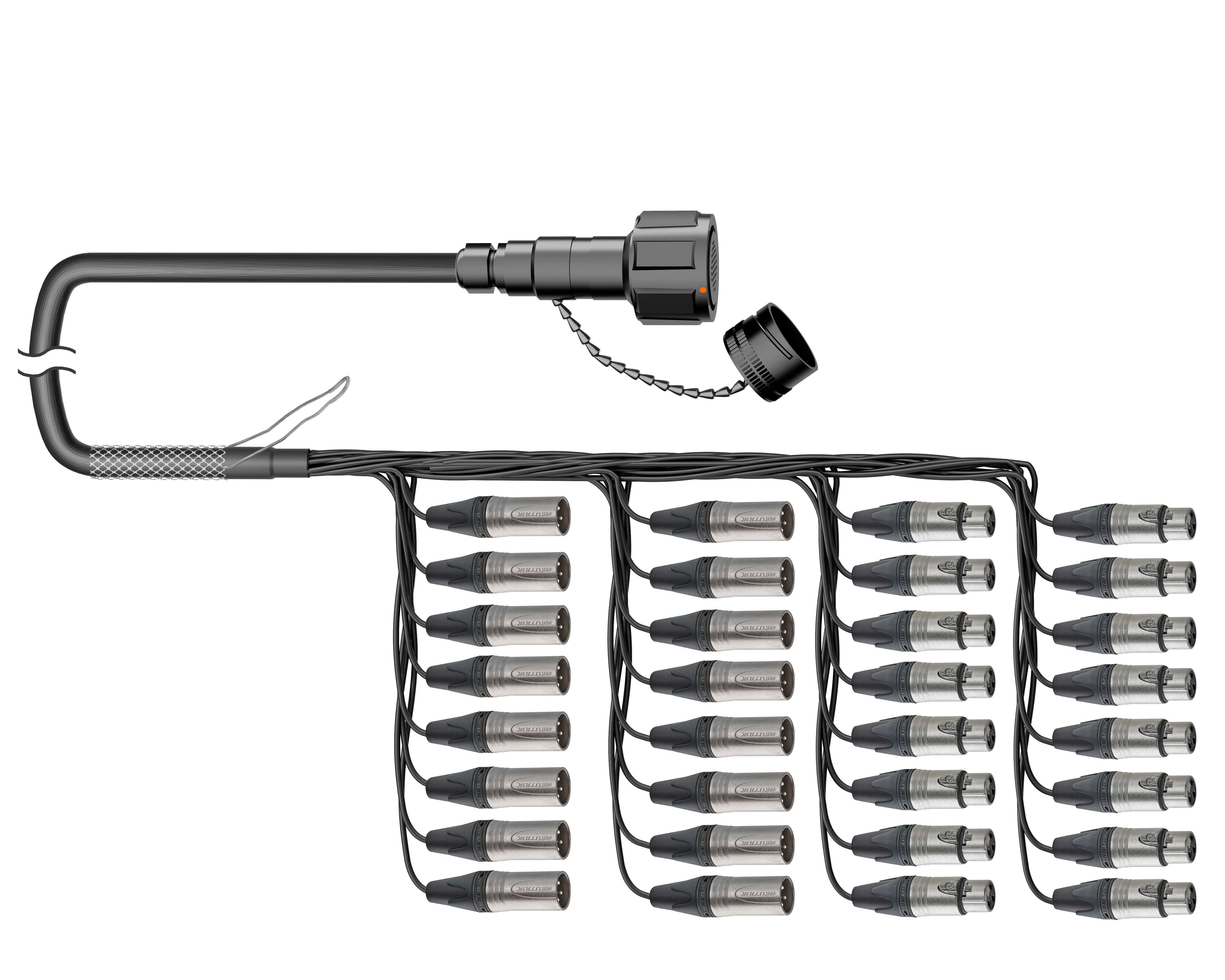 32-кан. (16-IN/16-OUT) аудиомультикорный кабель, Standart, Мультипин гнездо > коса (16х XLR3 штекер, 16х XLR3 гнездо), защитная корзина. Комплектующие: разъемы Круглый (Мультипин); Neutrik NC3MXX; NC3FXX; Мультикор аналоговый Canare MR202-32AT; цвет: черный.