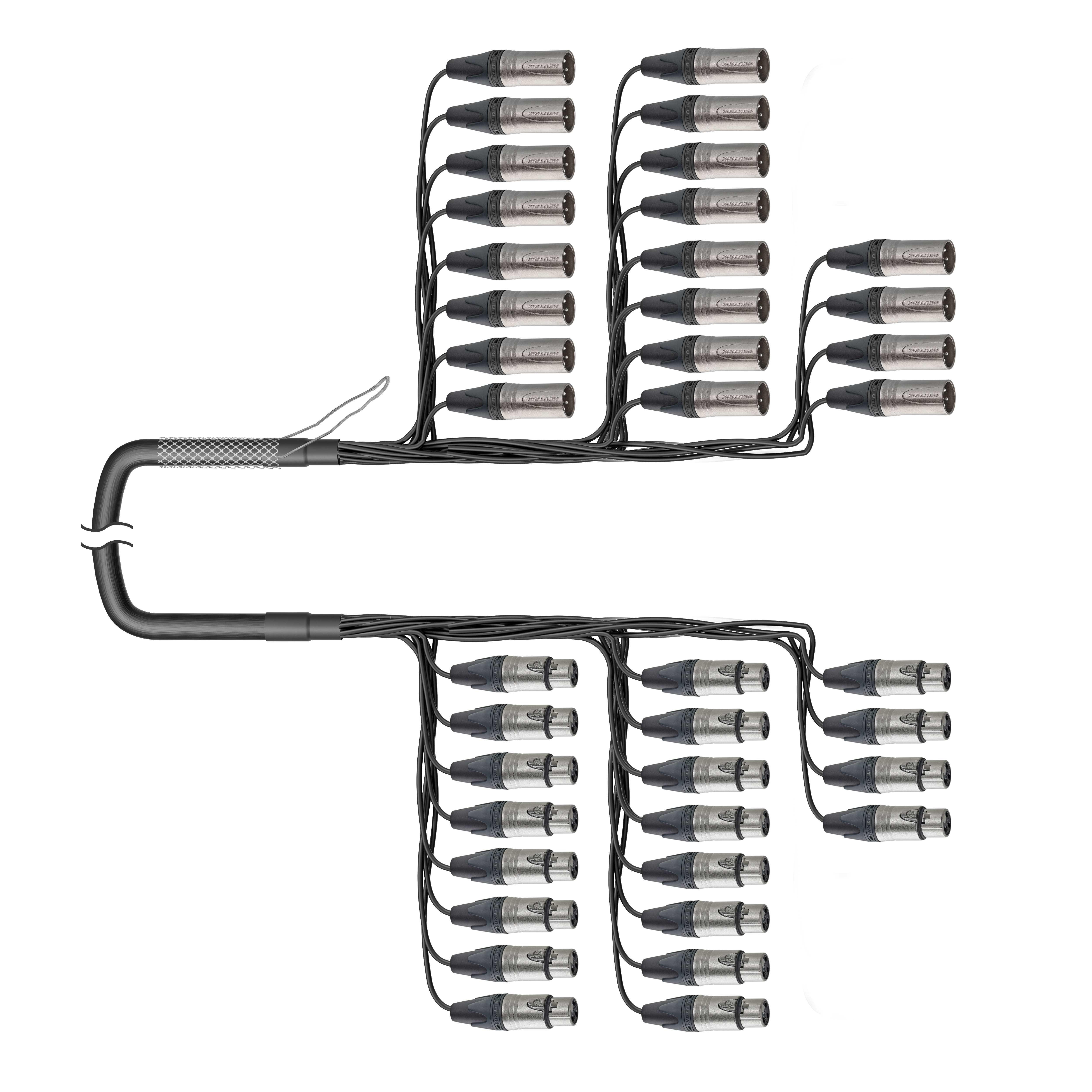 20-кан. (20-IN) аудиомультикорный кабель, Standart, коса (20х XLR3 штекер), защитная корзина > коса (20х XLR3 гнездо). Комплектующие: разъемы Neutrik NC3MXX; NC3FXX; Мультикор аналоговый Canare MR202-24AT; цвет: черный.