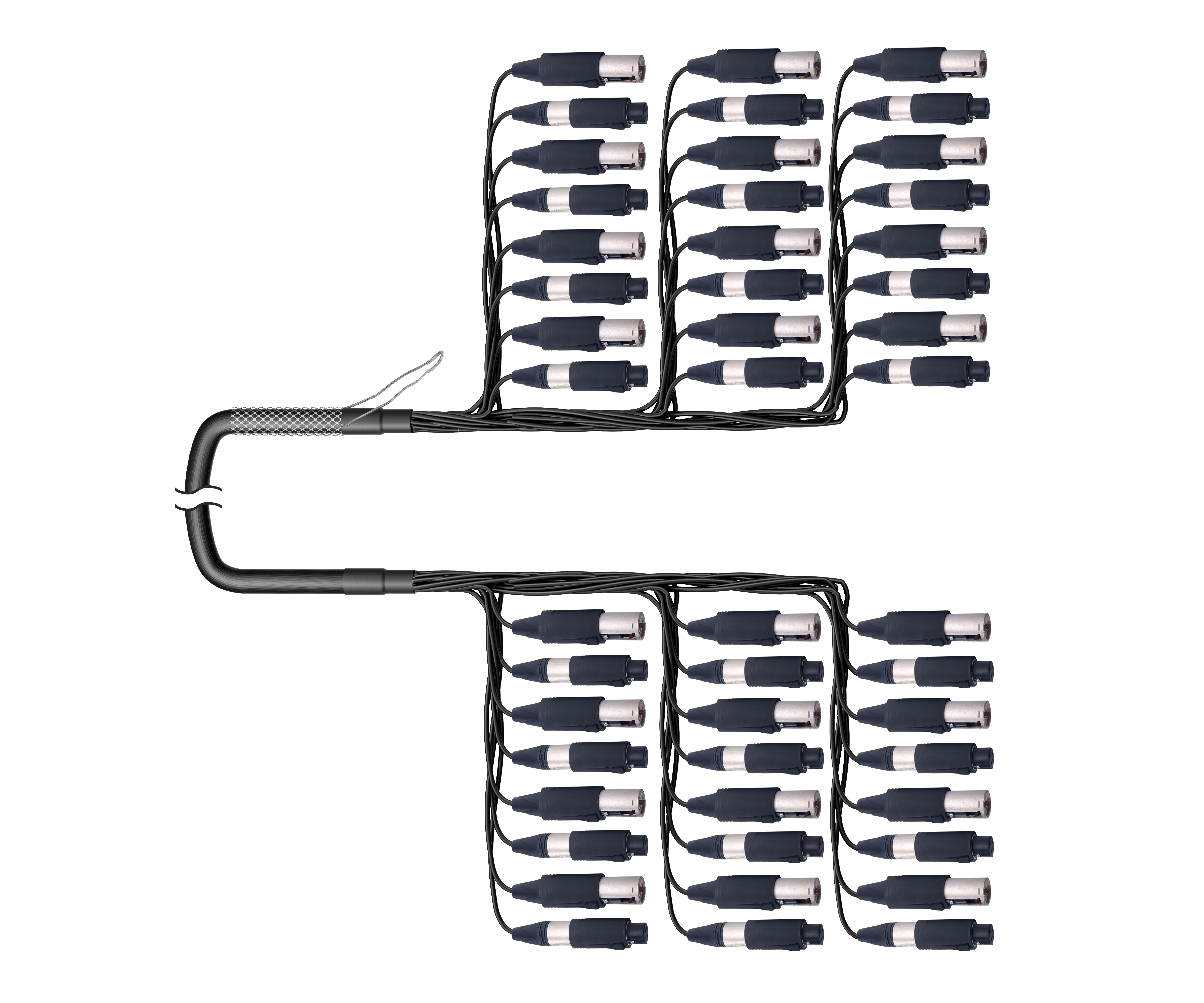 24-кан. (IN/OUT) аудиомультикорный кабель, Standart, коса (адаптер- 24х XLR3 штекер/гнездо), защитная корзина > коса (адаптер- 24х XLR3 штекер/гнездо). Комплектующие: разъемы Neutrik NC3FM-C (XLR адаптер мама/папа); Мультикор аналоговый Canare MR202-24AT; цвет: черный.