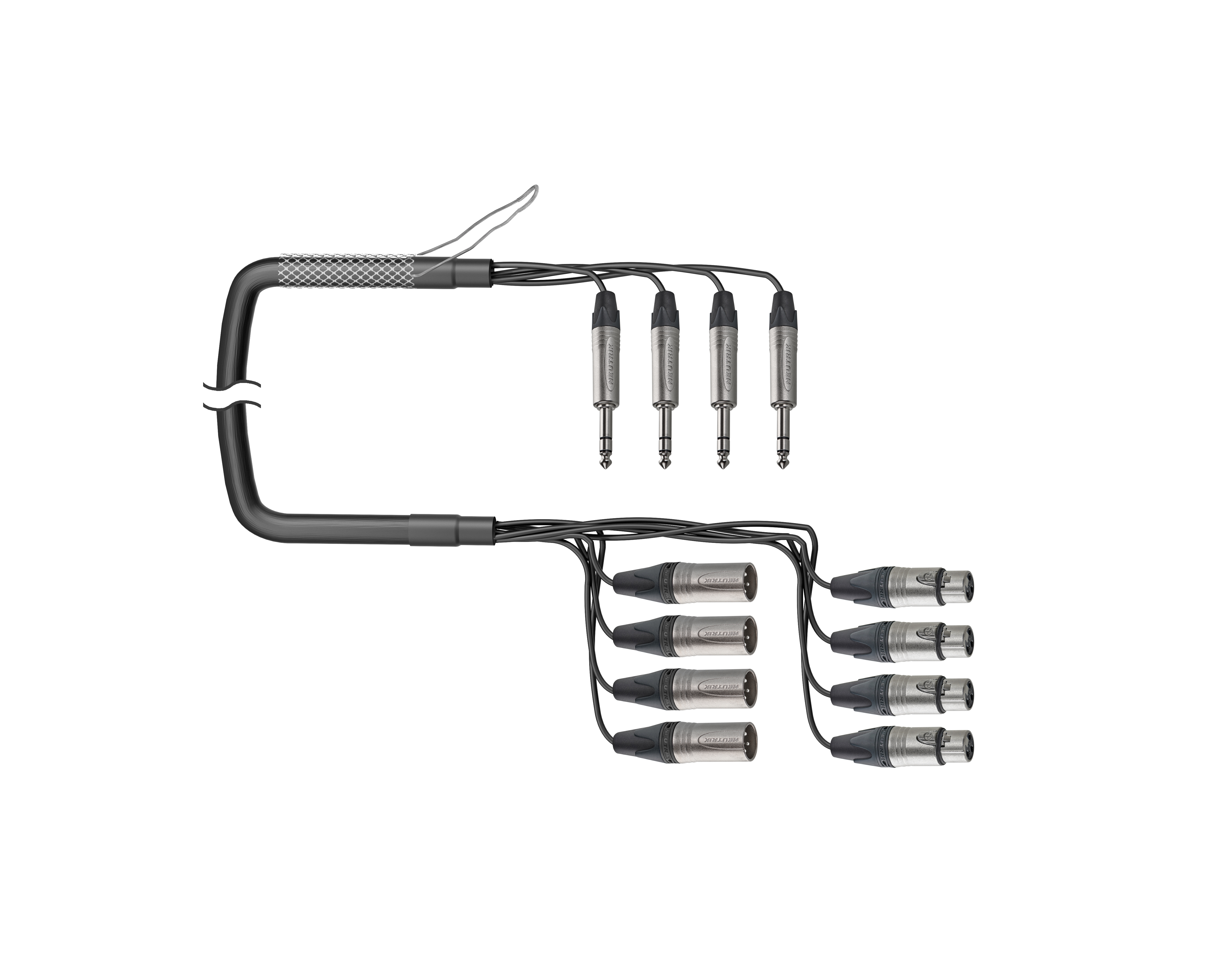 4-кан. Y-образный инсертный аудиомультикорный кабель, Standart, коса (4х Jack 6.3 мм стерео штекер), защитная корзина > коса (4х XLR штекер/4х XLR3 гнездо). Комплектующие: разъемы Neutrik NP3X; NC3MXX; NC3FXX; Мультикор аналоговый Canare MR202-8AT; цвет: черный.