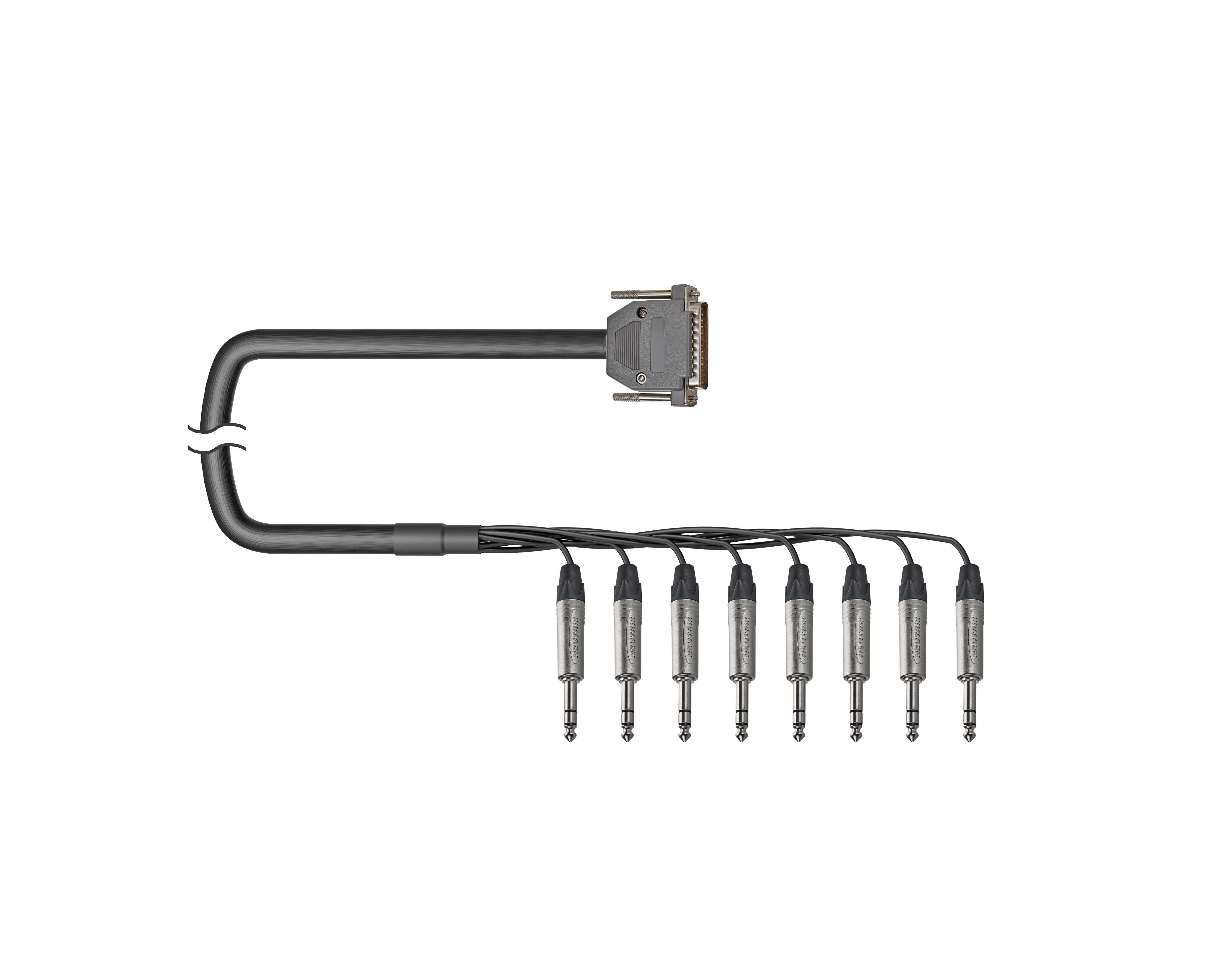 8-кан. TASCAM аудиокабель, Standart, D-SUB 25 пин штекер > коса (8х Jack 6.3 мм стерео штекер). Комплектующие: разъемы D-SUB 25; Neutrik NP3X; Мультикор аналоговый Canare MR202-8AT; цвет: черный.