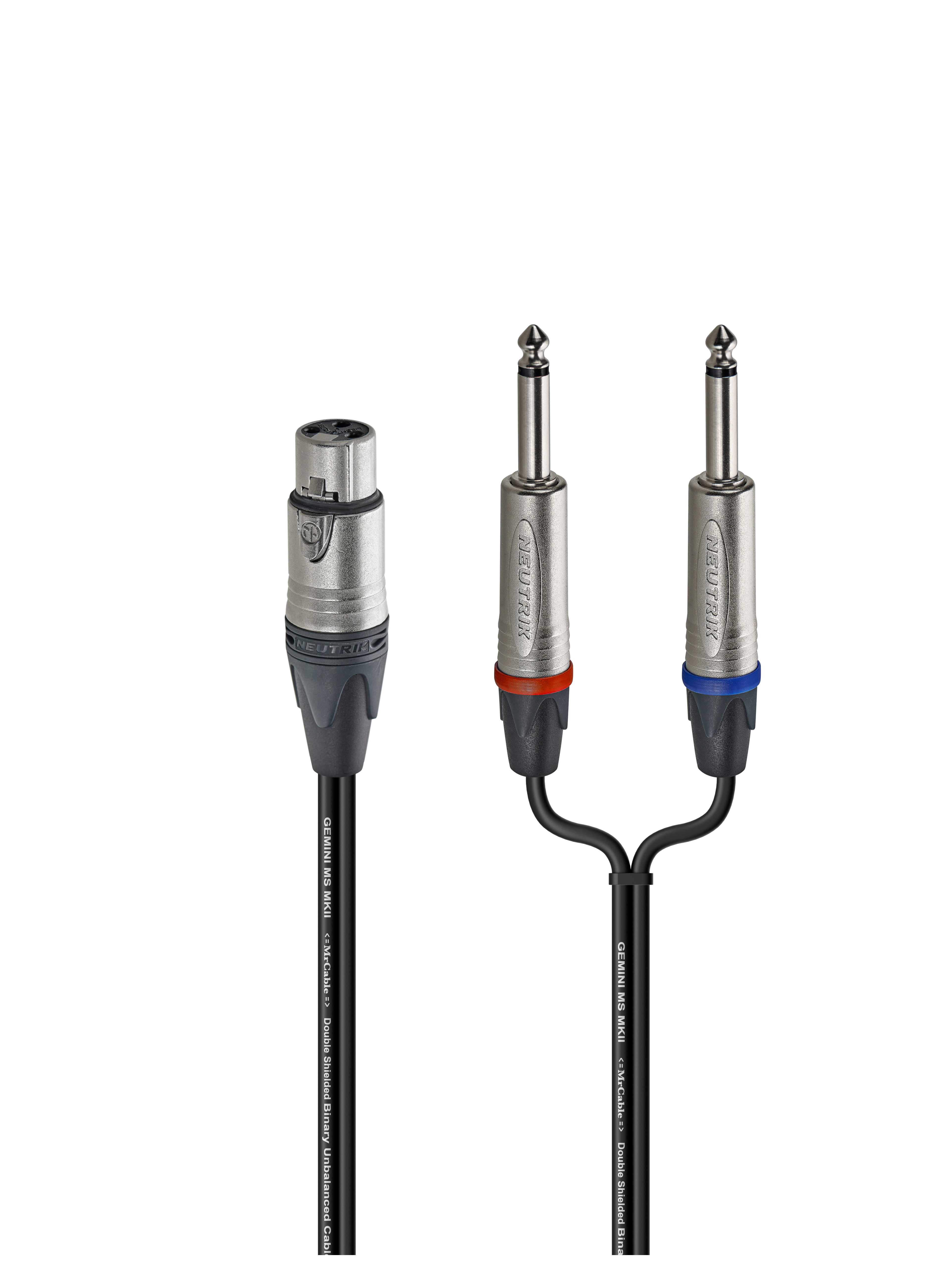 Переходной, параллельный аудио кабель, Standart, XLR3 гнездо > 2х Jack 6.3 mono штекер. Комплектующие: разъемы Neutrik NC3FXX; NP2X; Кабель MrCable GEMINI MS MKII; цвет: черный