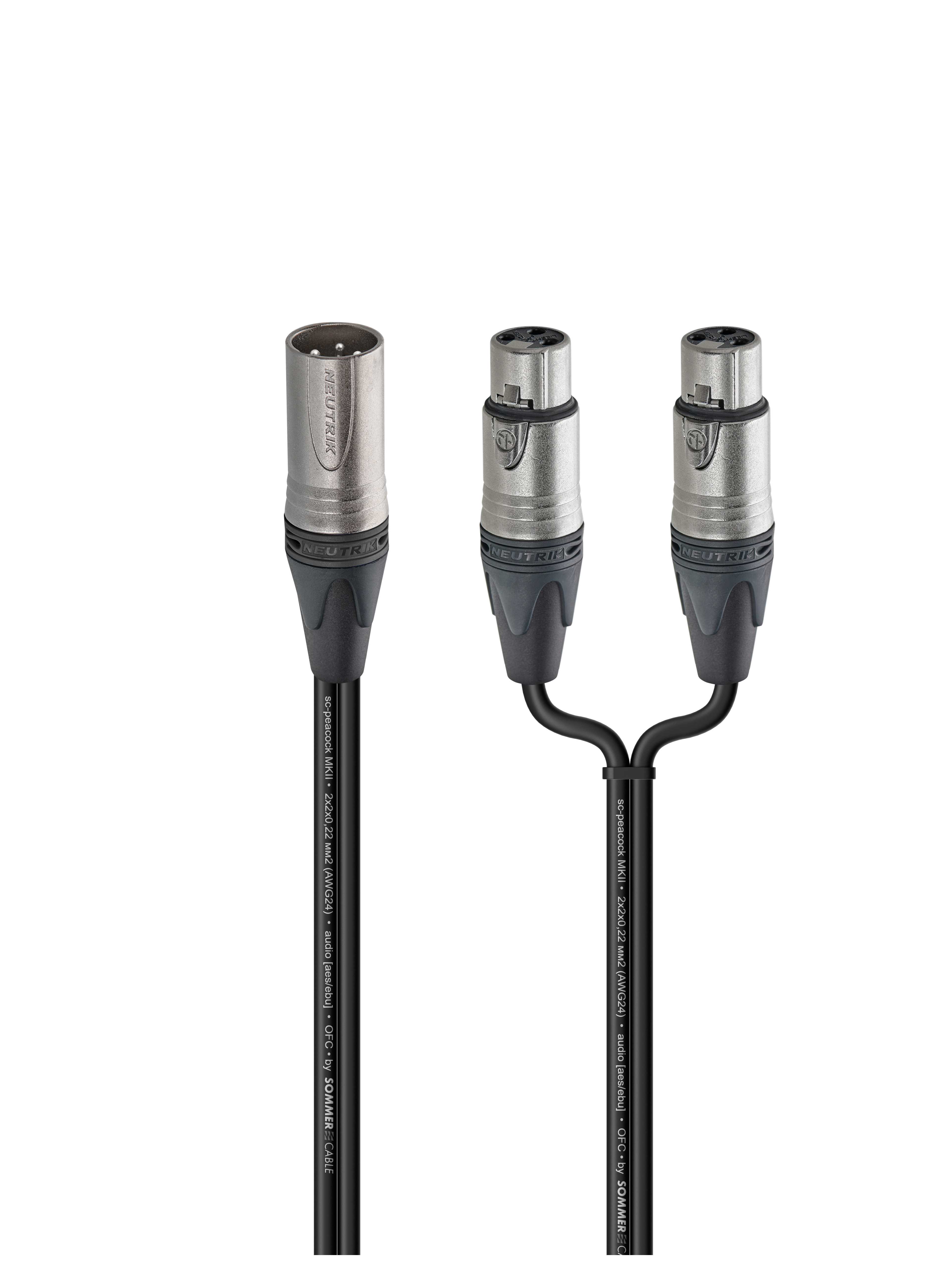 Переходной, параллельный аудио кабель, Standart, XLR3 штекер > 2х XLR3 гнездо. Комплектующие: разъемы Neutrik NC3MXX; NC3FXX; Кабель симметричный, сдвоенный, Sommer cable SC-PEACOCK MKII BLK; цвет: черный.