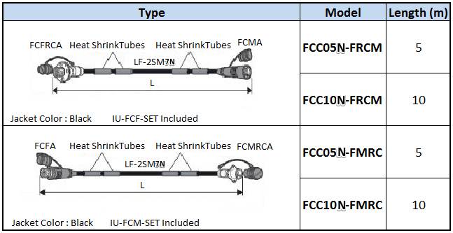 Комбинированный оптоволоконный кабель SMPTE/ARIB (с панельнвм разъемом), «FCFRCA штекер панельный- FCMA гнездо кабельный». Структура: тип разъемов (гибридные разъемы SMPTE 304M FMW-PUW Lemo), класс защиты IP68; тип кабеля SMPTE 311 (LF-2SM9N), тип волокна - одномодовый 9/125, питание - 2х0.61 мм² (1х21*0.18 мм) AWG 20, управление - 2х0.18 мм² (1х7*0.18 мм) AWG 25, общий экран - плетеный, луженая медь (91%), силовой элемент - стальной корд, внеш. диаметр 9.2 мм, внеш. оболочка износостойкий (PVC); цвет: черный