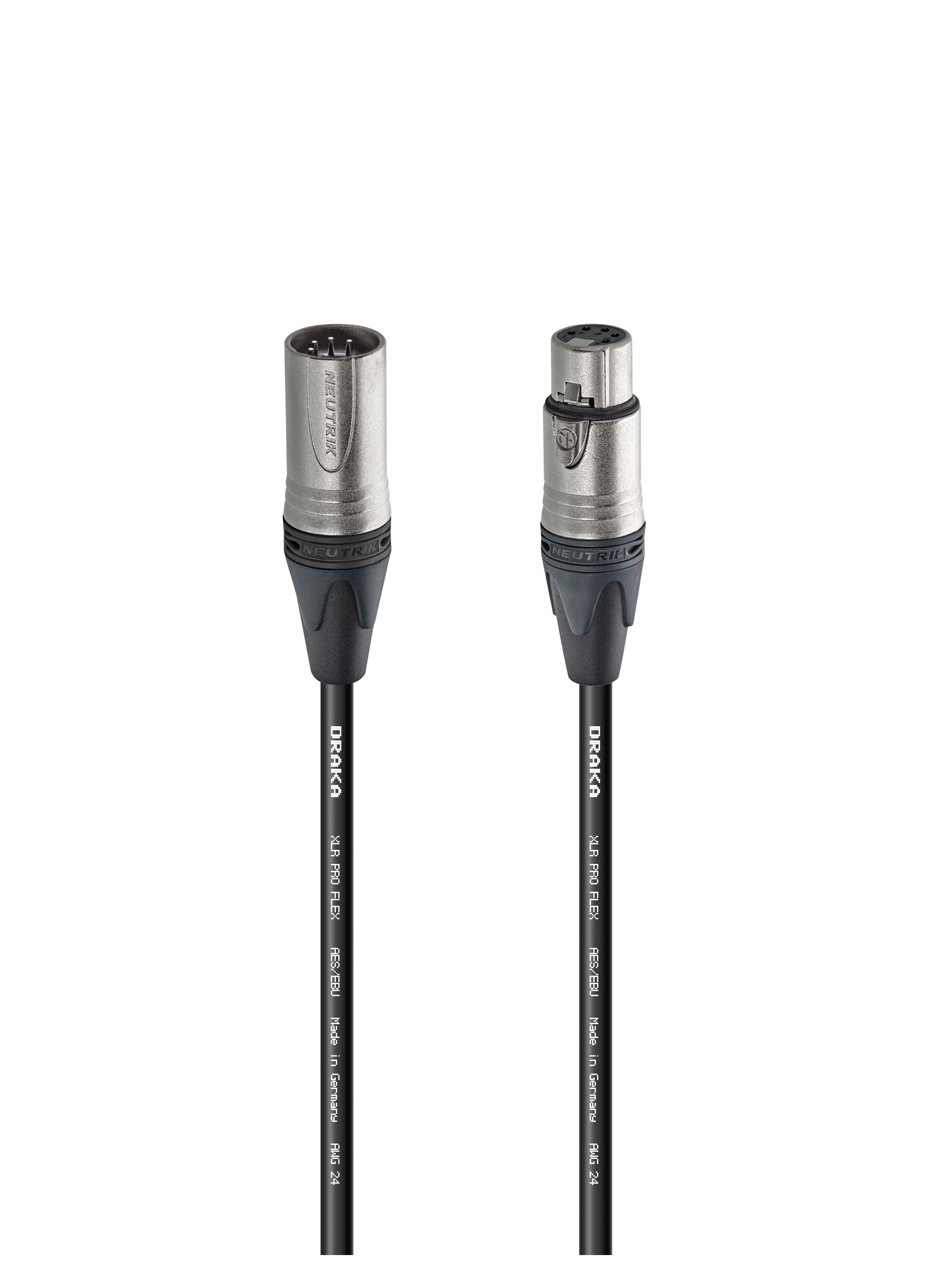Цифровой кабель DMX, Standar, XLR5 штекер > XLR5 гнездо. Комплектующие: разъемы Neutrik NC5MXX; Neutrik NC5FXX; Кабель DRAKA XLR PRO FLEX analogue / digital; цвет: черный.