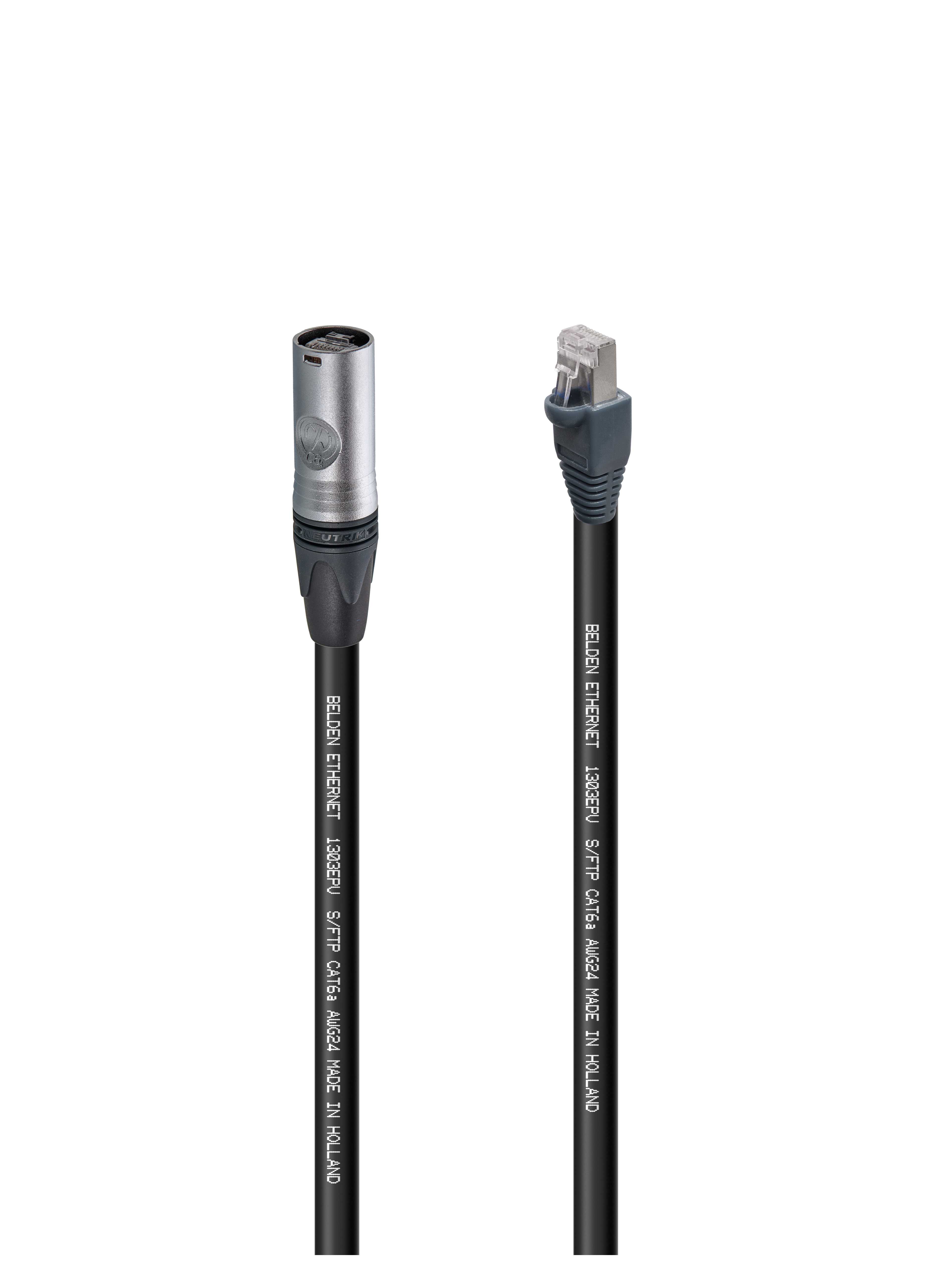 Кабель Ethernet, категория CAT 6a, повышенной прочности, XLR-RJ45 штекер > RJ45 штекер. Комплектующие: коннектор (RJ45) Cabeus 8P8C-SH-C7(1.5)-TWP, колпачок Cabeus CAP-8-GY; (XLR-RJ45) Neutrik NE8MX6; Кабель "Витая пара", туровый, Belden 1303EPU; цвет: черный