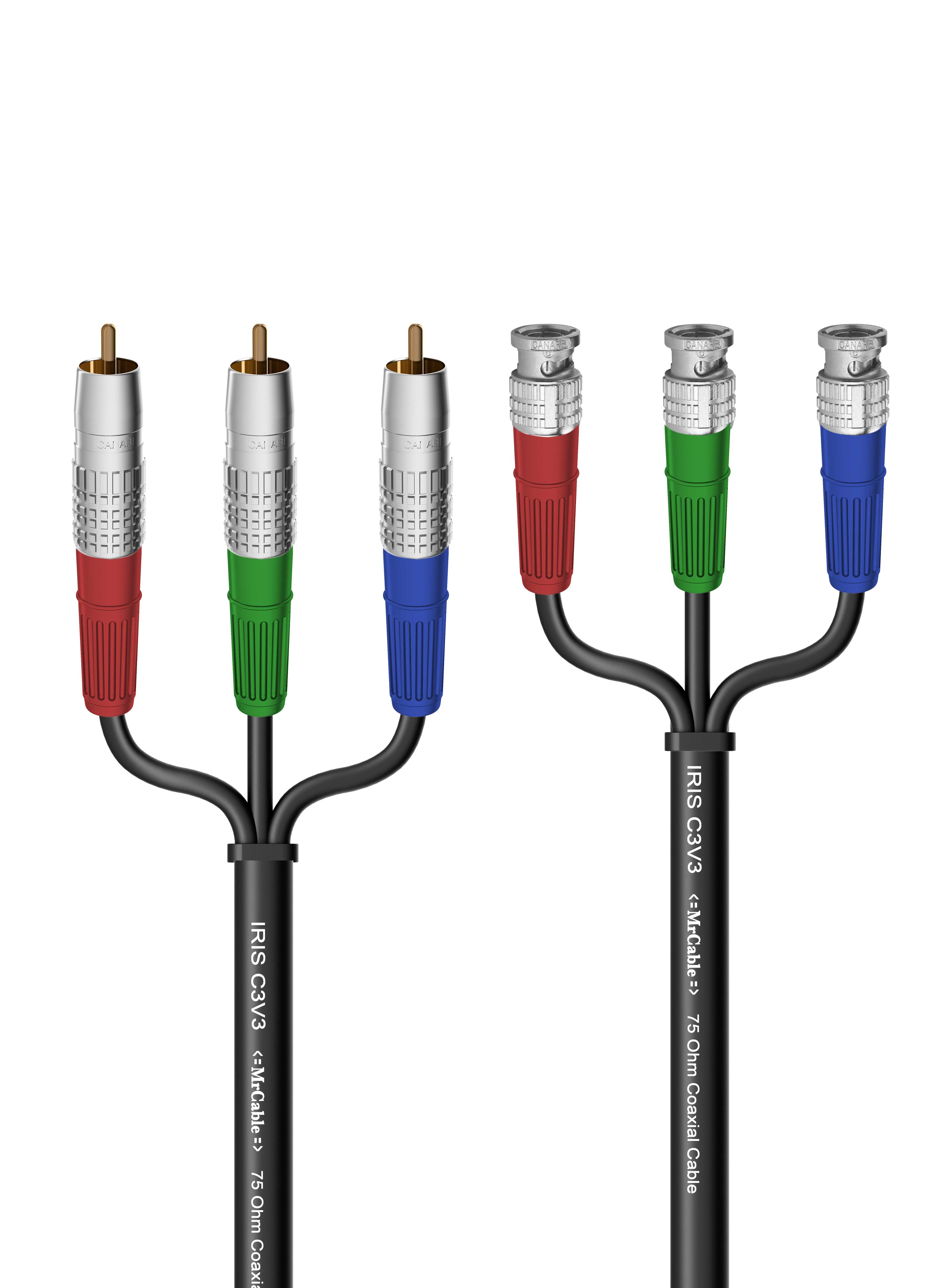 Видео кабель компонентный, RGB, 75 Ом, 3х RCA штекер > 3х BNC штекер. Комплектующие: разъемы Canare RCAP-C3A, BCP-A3; Кабель MrCable IRIS C3V3; цвет: черный.