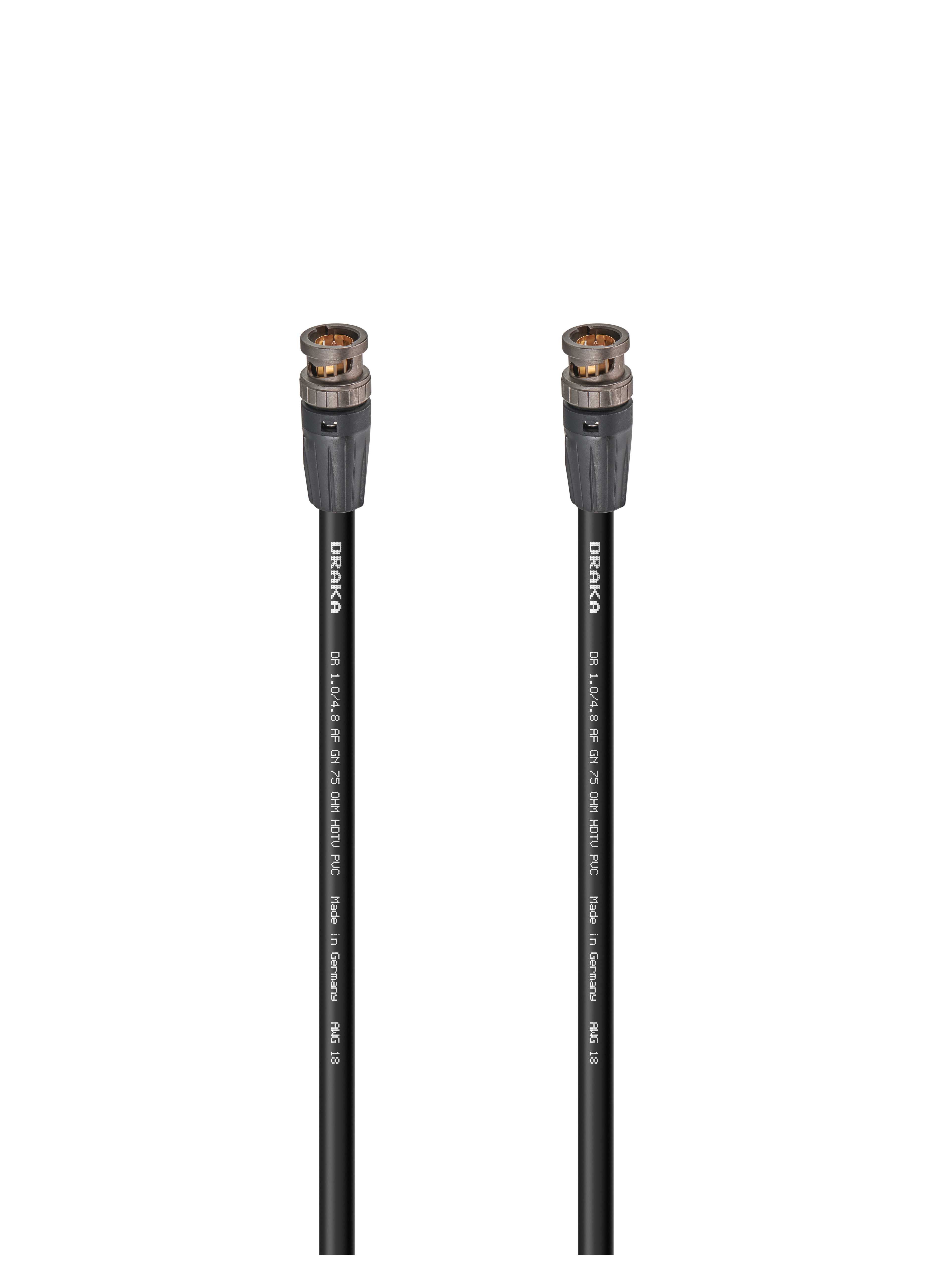 Видео кабель цифровой UHD-SDI/HDTV, 75 Ом, Standart 4K/8K, BNC штекер > BNC штекер. Комплектующие: разъемы Neutrik NBNC75BUU11X, Кабель DRAKA DR 1.0/4.8 AF GN 75 OHM HDTV PVC; цвет: черный.