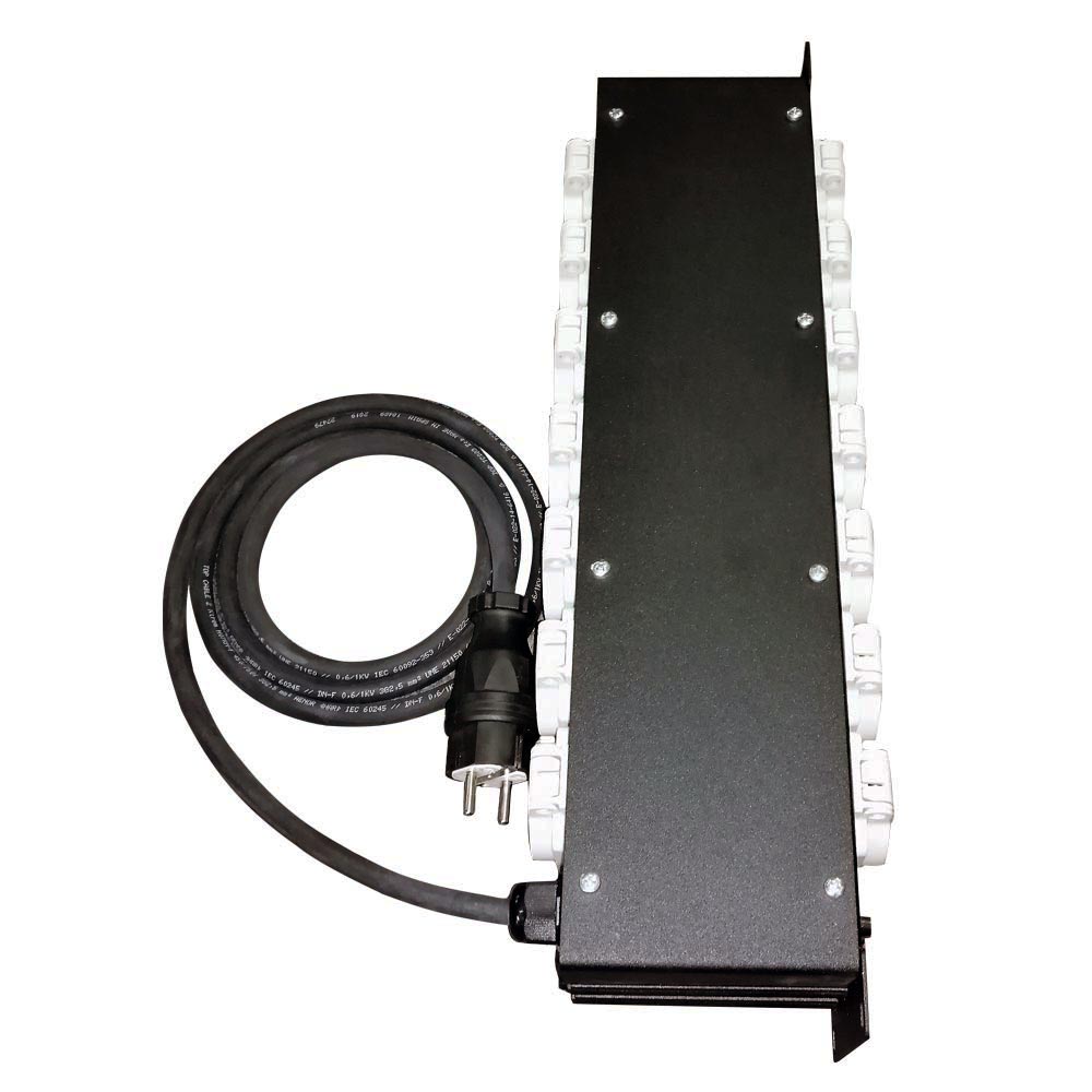 Вход: 2х метровый кабель H07RN-F 3G2,5 и обрезиненная вилка PCE Schuko 16A; Выход: панельная розетка 14хPCE Schuko 16A; Индикация: 1 индикатор фазы, 1 индикатор на включение; Защита: термопредохранитель на 16А; Габариты корпуса: Rack 19” 2 Unit (485x105x88мм)