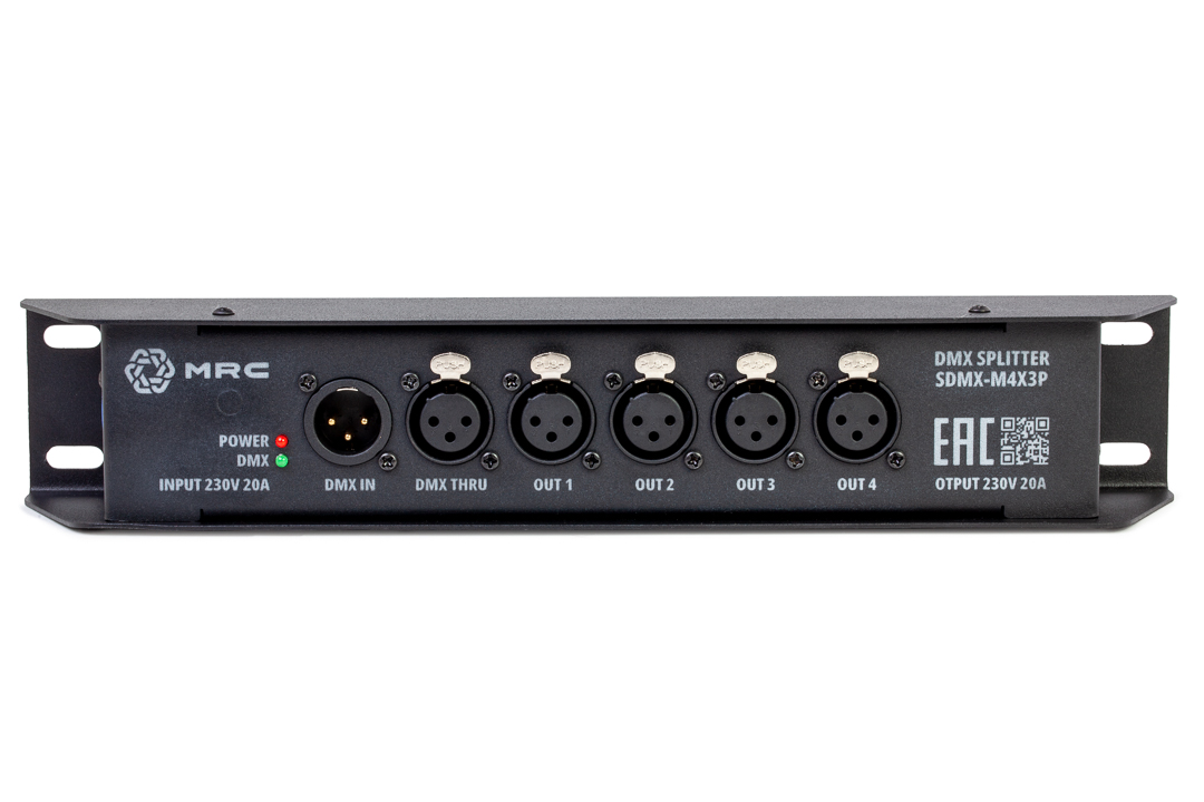 DMX- сплиттер. Вход: 1х XLR3 M; выход: 4х XLR3 F, 1х XLR3 F (проходной); проходной панельный разъем MRC PowerCon 20A/250В (MRC RPWDN-B); гальваническая развязка и усилитель сигнала на каждом канале; индикация: включение в сеть, наличие DMX сигнала на входном и выходных каналах; питание от сети 90-280В через панельный разъем MRC PowerCon 20A/250В (MRC RPWDN-A), возможность каскадного подключения (кабель в комплекте не идет)