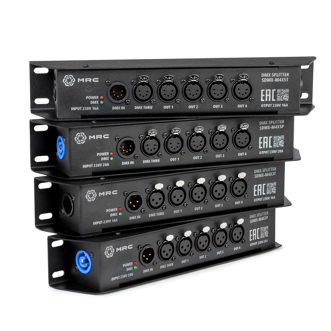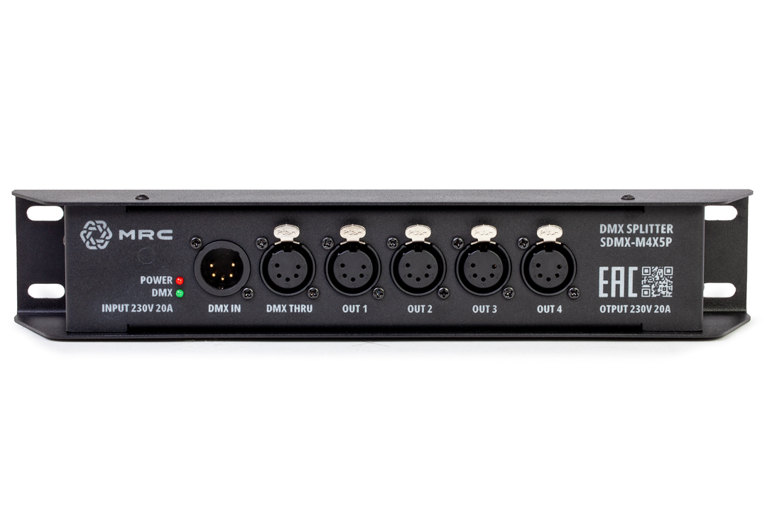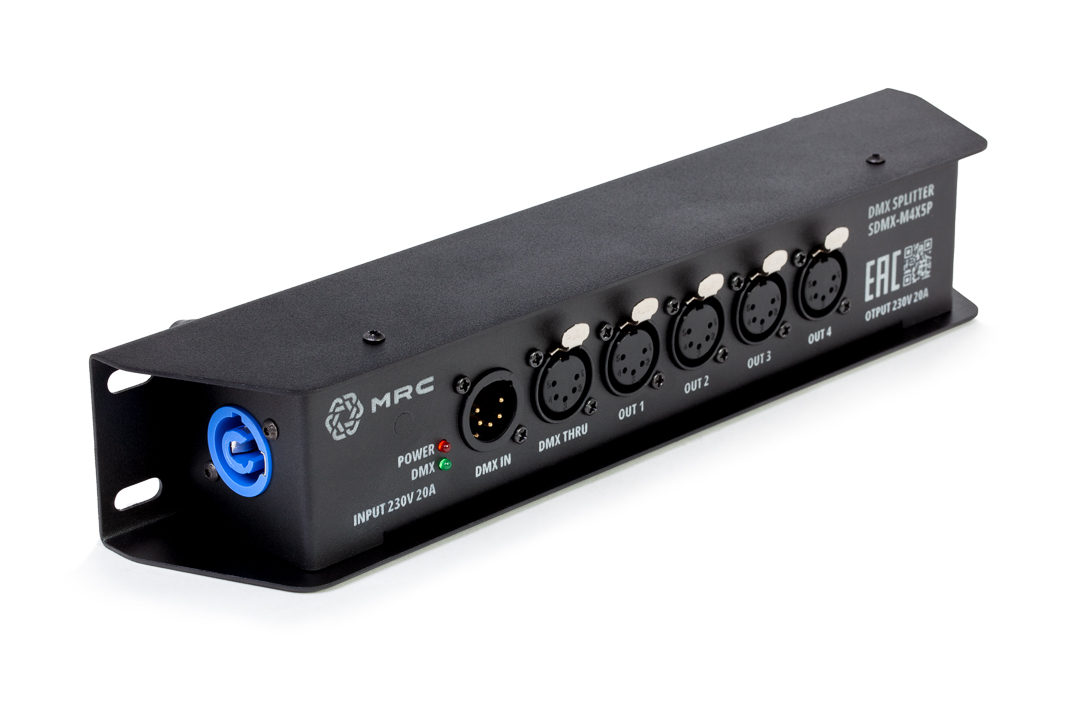 DMX- сплиттер. Вход: 1х XLR5 M; выход: 4х XLR5 F, 1х XLR5 F (проходной); проходной панельный разъем MRC PowerCon 20A/250В (MRC RPWDN-B); гальваническая развязка и усилитель сигнала на каждом канале; индикация: включение в сеть, наличие DMX сигнала на входном и выходных каналах; питание от сети 90-280В через панельный разъем MRC PowerCon 20A/250В (MRC RPWDN-A), возможность каскадного подключения (кабель в комплекте не идет)