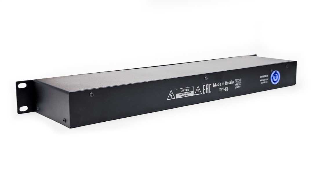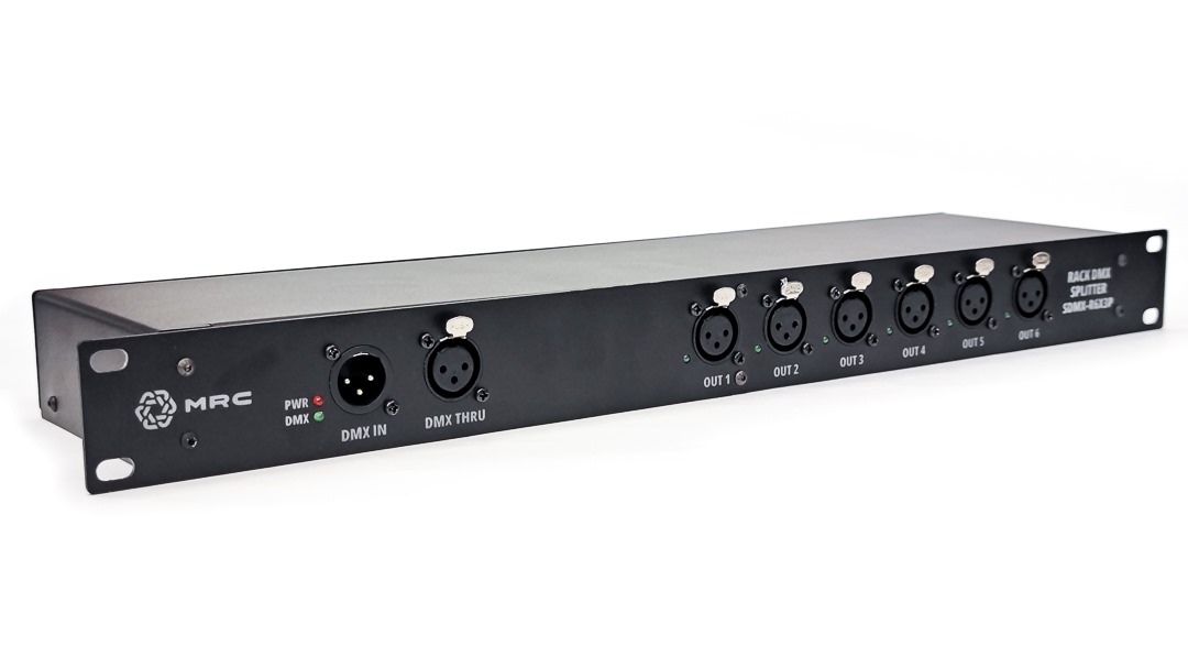 Рэковый DMX- сплиттер (Rack 19″ 1U). Вход: 1х XLR3 M; выход: 6х XLR3 F + 1х XLR3 F параллельно входному разъему (Link); гальваническая развязка и усилитель сигнала на каждом канале; индикация: включение в сеть, наличие DMX сигнала на входном и выходных каналах; питание от сети 100-250В через панельный разъем MRC PowerCon 20A/250В (MRC RPWDN-A), кабель 1.5 м / MrCable PA/S-01,5-GAB3G1-PXN (поставляется с устройством)