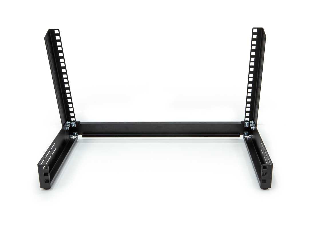 19" настольная рэковая стойка с регулировкой угла наклона, высота 6U, сталь 1.5 мм, углы наклона: 90°, 85°, 80°, 75°, возможность установки дополнительного прибора Rack 19″ 1U с обратной стороны стойки, резиновые противоскользящие ножки. Комплектация: рэковый крепеж рассчитанный для 6 шт. 1U панелей, глухая панель 1U, 1шт. Цвет: черный